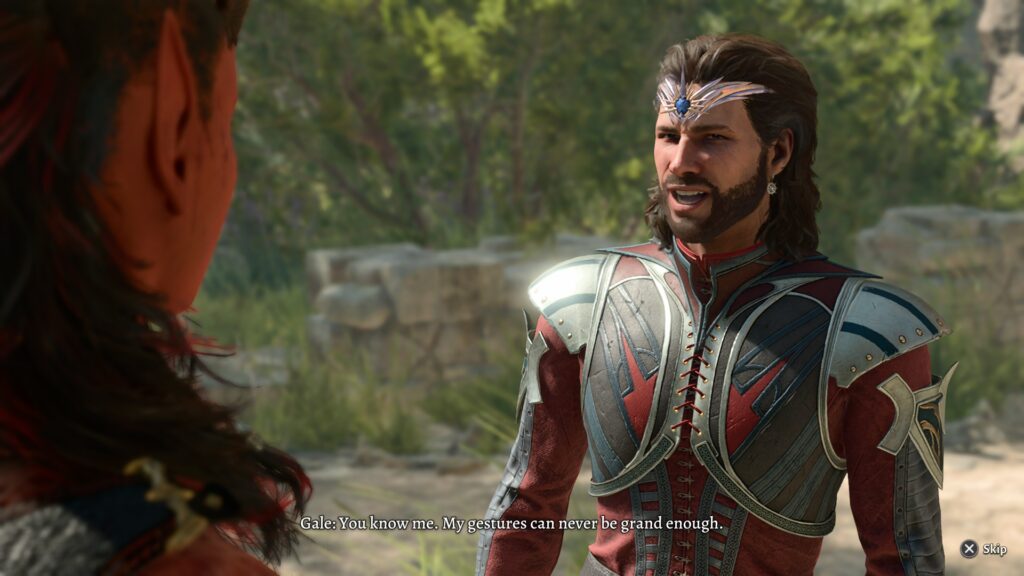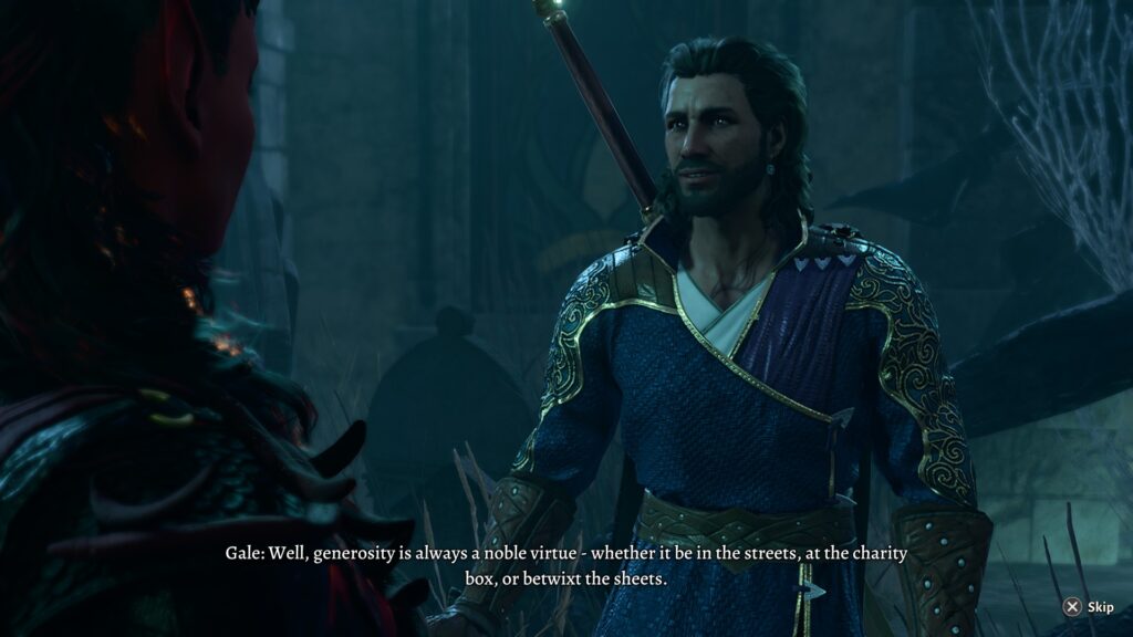 My plan for this playthrough was to romance Gale, the erudite wizard that Bill had romanced the last time. I wanted to see his romance for myself, but my intentions are not entirely altruistic — one version of Gale can actually help Karlach with her engine problem. As it turns out, this version of Gale is the opposite of the one that I had eavesdropped on in 2/14.5, so it did feel like it was unfolding in a genuine ‘fresh’ way for me.