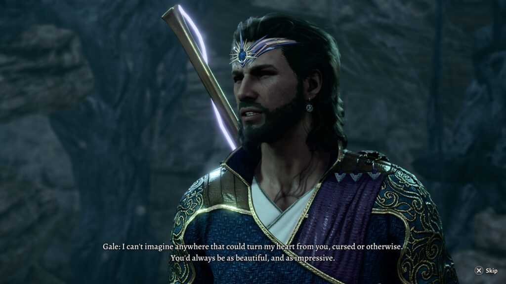 My Karlach made several choices to support him in the path he was growing on, maybe to the point that it wasn’t quite canon-accurate. Gale is quick to declare his interest — he might actually be the easiest character to romance. He’s sweet and articulate, sometimes a little overly so. He has a flying cat and a huge home library, which are definite selling points. I even got sexy scenes that Bill had never gotten. Things seemed like they were going well.