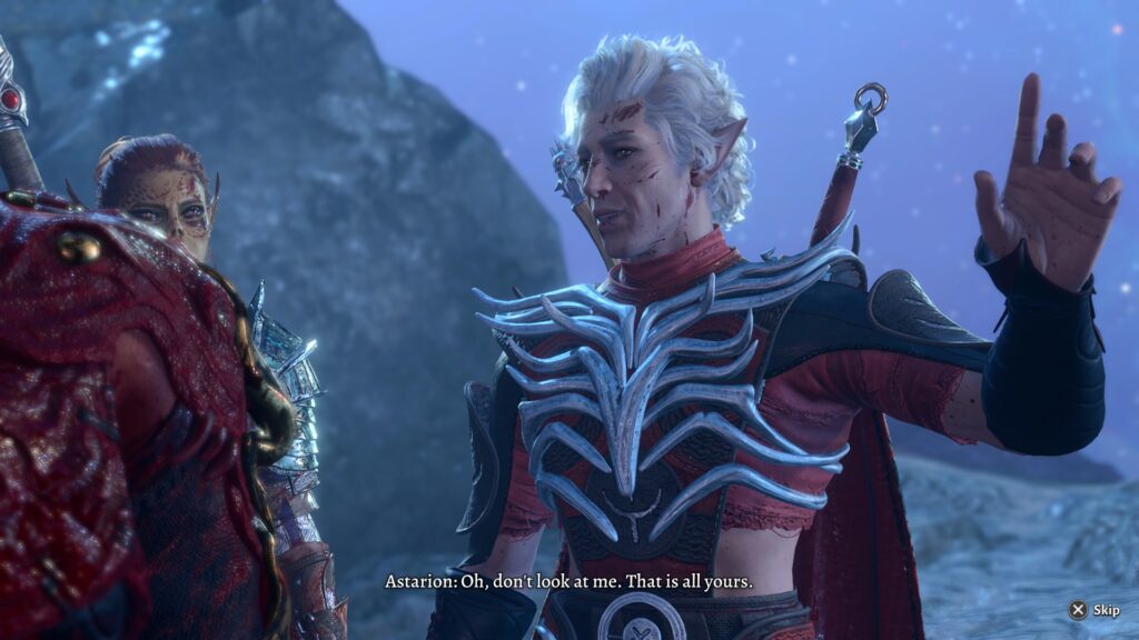 The second one is Karlach’s soliloquy. If you’ve played the game, you know exactly which one I mean. If you haven’t, you’ll know it as soon as you hear it. It is one of the best performances in the game, and in my completely unbiased opinion, freaking award-worthy across any media. I cried watching that scene the first few times. This playthrough was the first one that I didn’t, because while Karlach still says the main points, it is an internal monologue thinking to herself, and it just hits differently than her passionately emoting out loud.