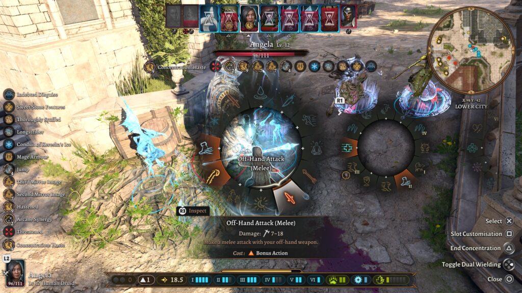 Druid Angela is about to hit an enemy with an off-hand attack. The tooltip says “Damage 7-18”, but that doesn’t include the bonuses from her magic gear.