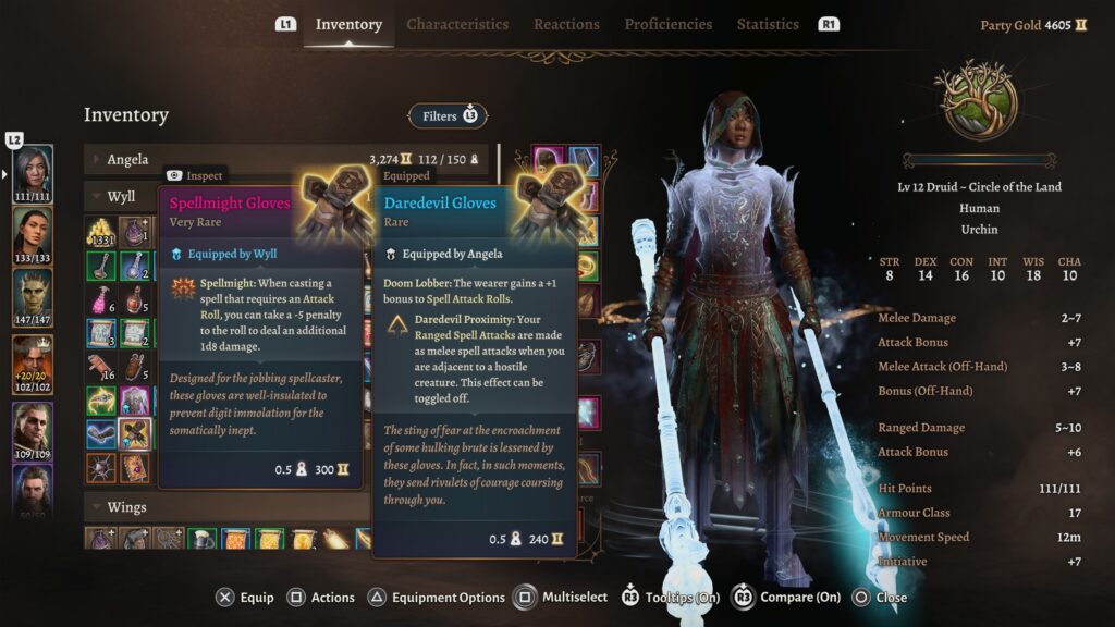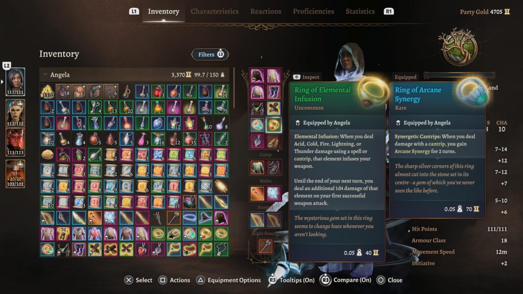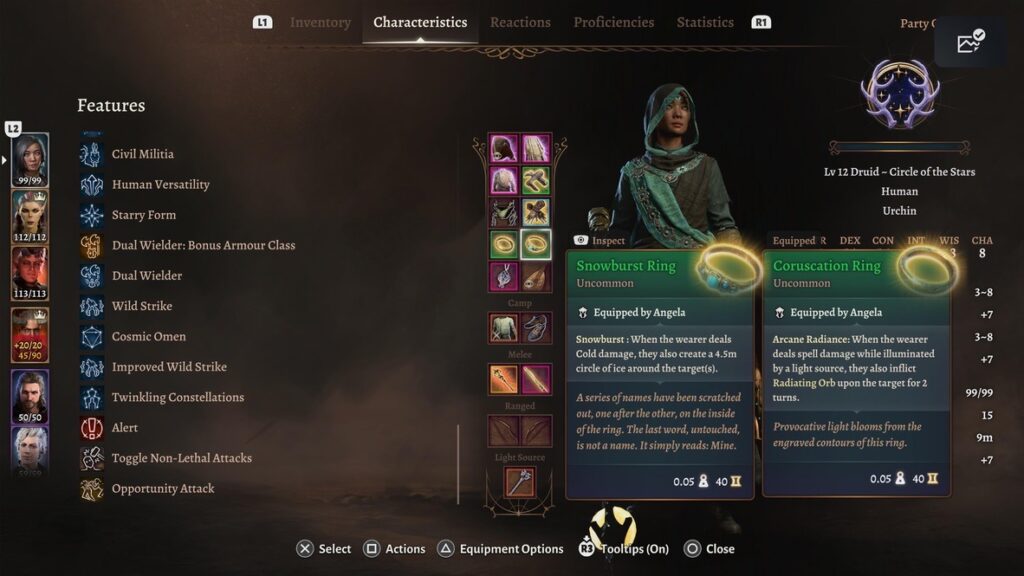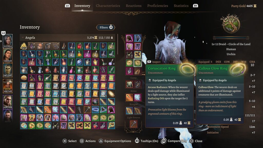 There’s also the combo Callous Glow Ring and Coruscation Ring, which I tried on her for a while. This combination is excellent for any spellcaster that inflicts multiple hits in a single turn; they’re great for Eldritch Blast or Magic Missile builds. But Arctic Druid Angela typically only casts one or two spell attacks per combat round, so this may not be the best choice for her.