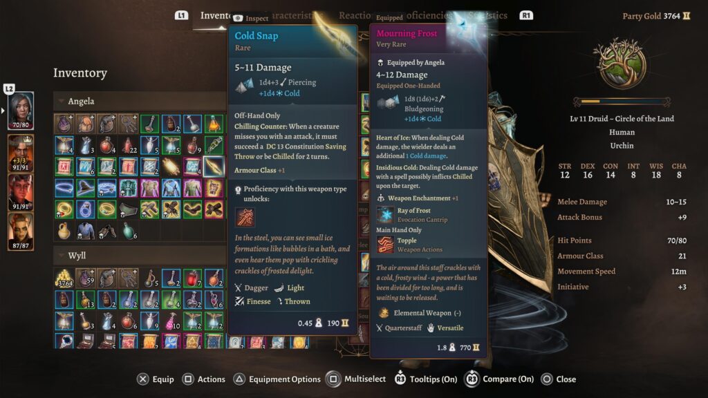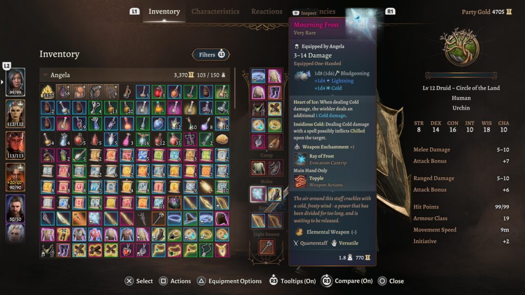 For Arctic Druid Angela, the staff you want to acquire is Mourning Frost. She’ll be using it for the rest of the game. The principle reason is that it gives her the cantrip Ray of Frost, which Druids can’t otherwise get without a Feat like Spell Sniper. Ray of Frost is “bread and butter” cantrip; much of the rest of her gear is going to key off it.