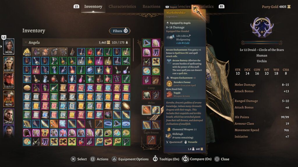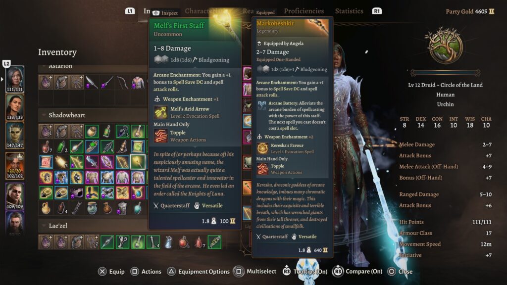 If you are using a desktop interface, you can consider starting with Mourning Frost in your main hand, casting Shillelagh, then swaping it into your off-hand. On a desktop, it’s just dragging a couple of icons. On a console, this takes several moves; it’s possible to waste so much time that the effect goes away. Also, if at any point Markoheshkir is not equipped, Kereska’s Favor goes away; it’s probably best to skip an attempt at swapping.