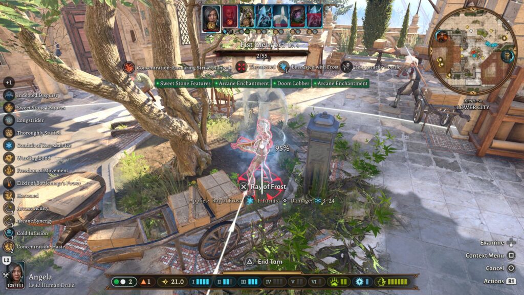 Arctic Druid Angela’s general strategy is to cast an Ice spell, most likely Ray of Frost, followed by an off-hand melee attack as her Bonus Action.