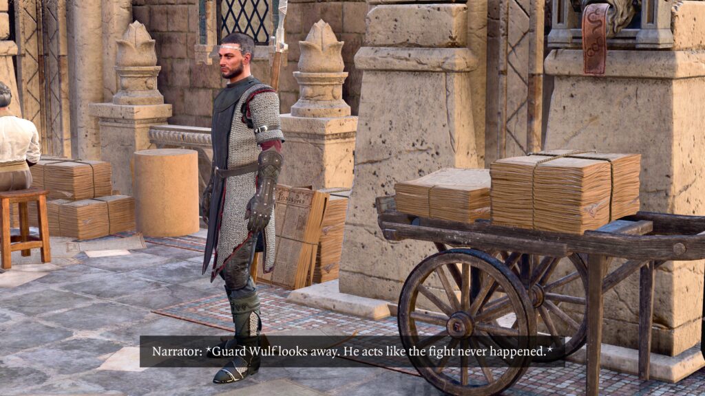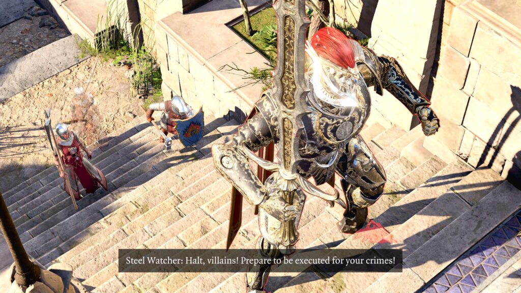If something illegal happens within sight of a witness (and there were plenty of civilian witnesses in the area), the game can spawn a group of Flaming Fist mercenaries to attack the players. Basically these four came out of nowhere.