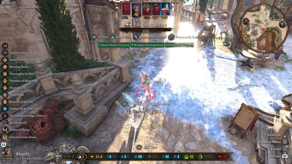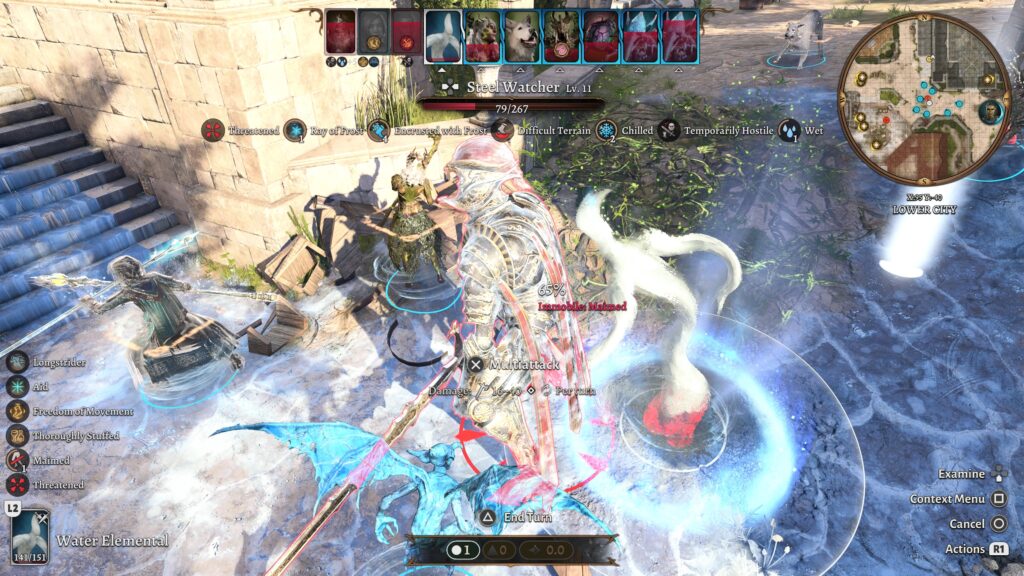 From a Balanced-mode test. You can see the large areas of ice on the ground, caused by a previous turn’s Create Water and Ice Storm. This is no problem for Arctic Druid Angela, but a substantial problem for Fist Glenova. Fortunately, it won’t be her problem for much longer. Again, note the number of ice-based conditions inflicted on Glenova due to Druid Angela’s Ray of Frost as augmented by her gear. I mentioned before the Create Water + Ice Storm combo. The first creates a large area in which all the enemies now have the Wet condition. The second slams with enemies with double Cold damage due to being Wet, and creates a large Ice surface to slow the enemies’ walking speed and might cause them to fall Prone. (For these test fights, a problem is that Steel Watchers can’t fall down; at least the ice still slows them if they try to walk across it.)