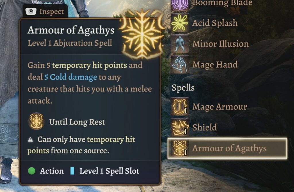 To get Armor of Agathys, Druid Angela needs to respec with one level of White Draconic Ancestor Sorcery. The tooltip describes the Level 1 spell. If cast as a Level 6 spell, it would provide 30 temporary hit points and deal 30 Cold damage to attackers.