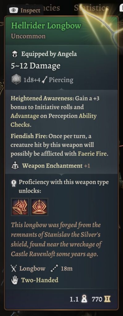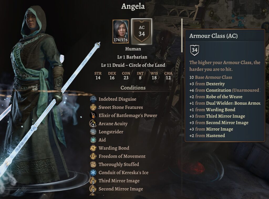 In terms of combat stats, the one that Druid Angela lacks in comparison is Spell Save DC. In giving up the Elixir of Battlemage’s Power, and holding Mourning Frost instead of another staff that boosts Spell Save DC, she loses Arcane Acuity.