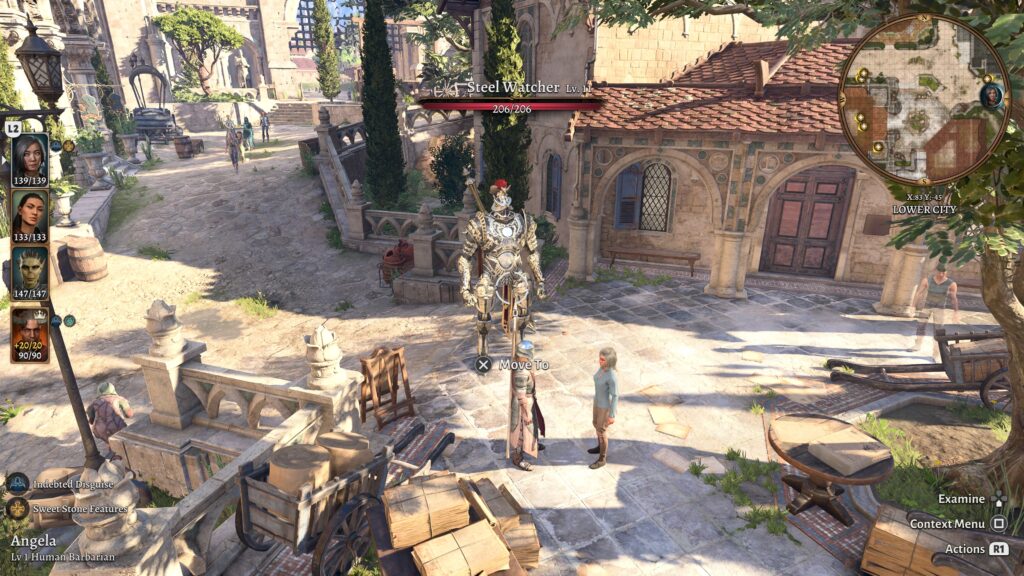 The game location for my test combat is pretty close to the location Garsen uses. There’s one big difference: Due to how I approached the game’s story, the guard patrols are hostile to me. If I move Druid Angela to within their field of view, they’ll attack immediately.