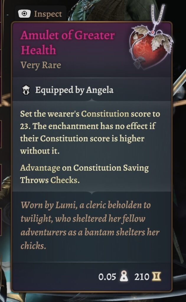 Create Water is a spell that most casters can acquire. If you cast the spell at higher levels, it creates a Wet surface over a larger radius. Wavemother’s Robe casts the spell at 4th level, creating a huge area suitable for lovely, lovely ice surfaces. - The Amulet of Greater Health sets Constitution to 23. If Druid Angela wears no armor, and with the Barbarian’s Unarmored Defense, that adds +6 to her Armor Class. It also gives Advantage on Constitution Saving Throws. That is a big bonus to maintaining Concentration.