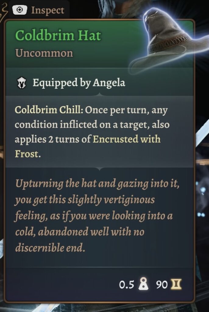 One question I didn’t answer to my satisfaction is whether she should weave Hood of the Weave for +2 to her Spell Attacks, or the Coldbrim Hat which makes it more likely that an enemy will slip on ice and fall Prone.