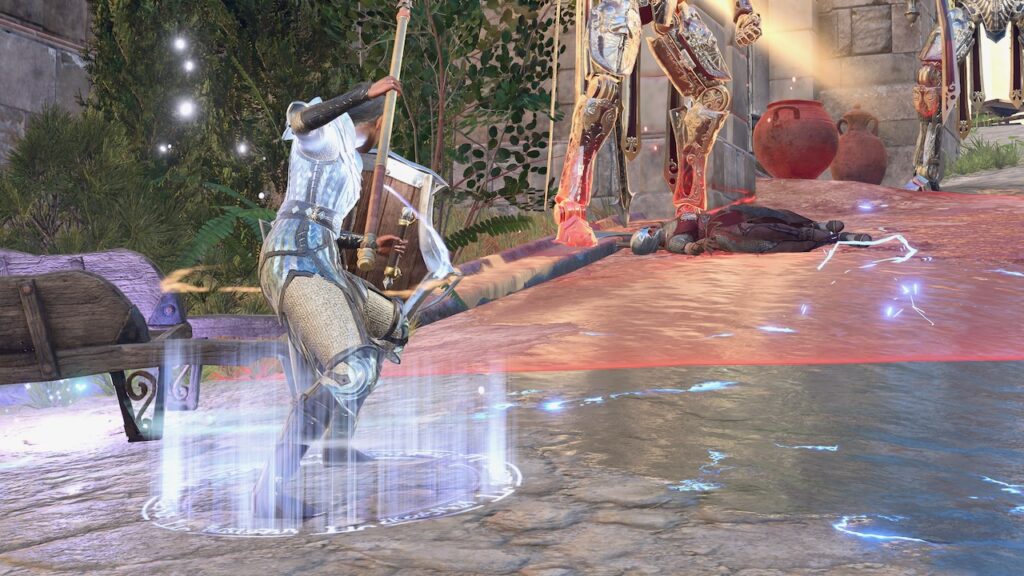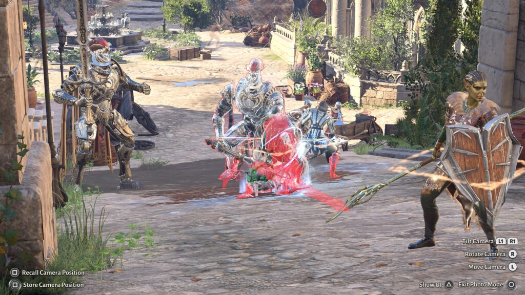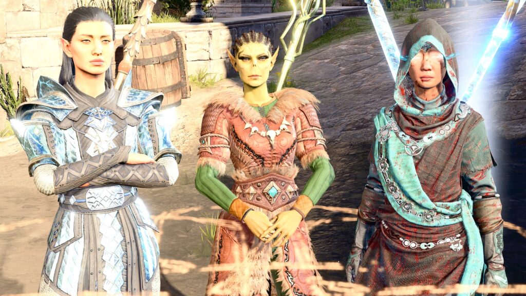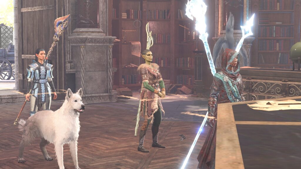 When I returned to BG3, I discovered that I’d left the big battle’s test session running on my PS5. I took a quick look at the game. I saw that Druid Angela, Karma, and Wings were still standing around. I decided to walk them over to Sorcerous Sundries.