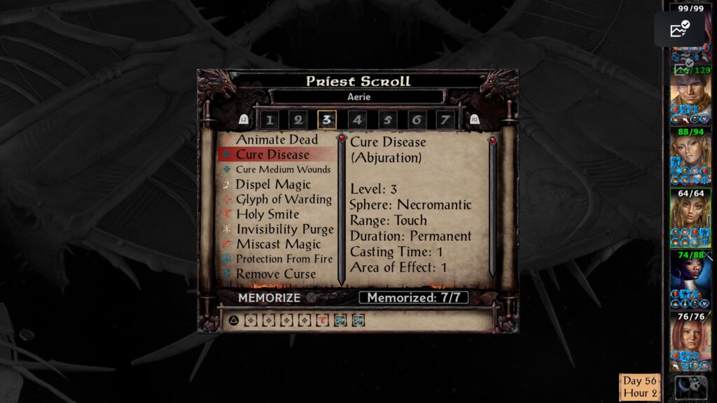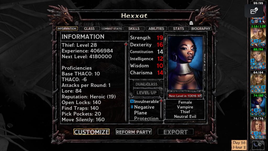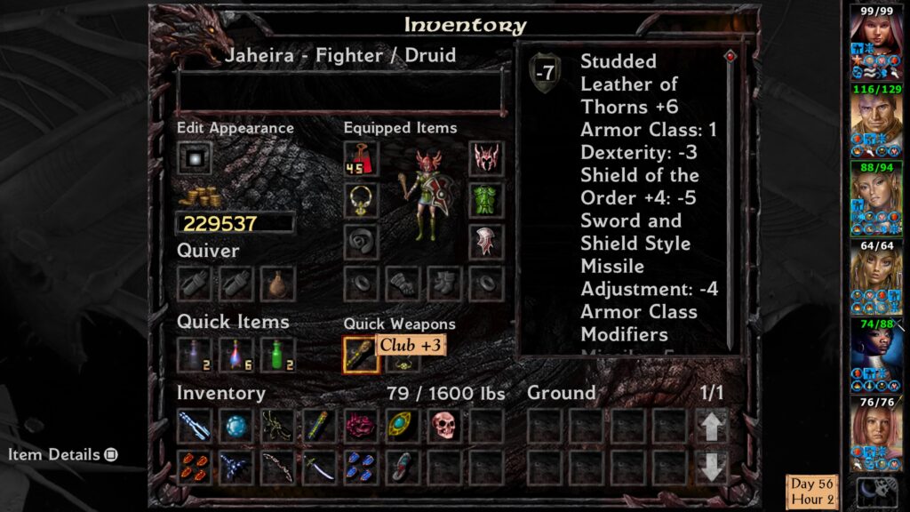Spell slots are among the reasons I don’t like D&D. BG1+2 embrace the concept whole-heartedly, with the D&D2e system being even more restrictive than the D&D5e system in BG3. Here you see where you have to pick which specific spells you’ve memorized at a specific level. If you want to cast Dispel Magic but didn’t memorize it, you’re out of luck; you’ll have to pick a new set of spells to memorize during your next Rest. For what it’s worth, the game seems to have a complete implementation of D&D2e. I was brought back to the days of THAC0 (“to hit Armor Class 0”), in which the lower the AC was, the better it was. It led to ACs with negative values, which perhaps had value teaching negative numbers to a generation of youngsters who were failing basic math. I managed to get one of my characters to AC -7. Yay?