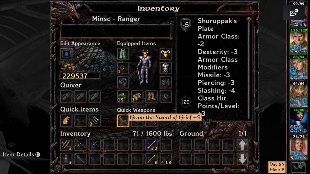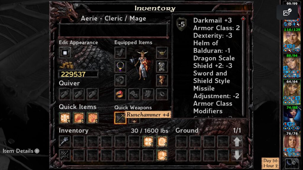 A typical character inventory screen, from near the end of the game. The resolution of the character’s image on this screen is higher than what you see in standard gameplay. This is not a criticism, merely an observation. BG1+2, like BG3 now, is a creation of its time.