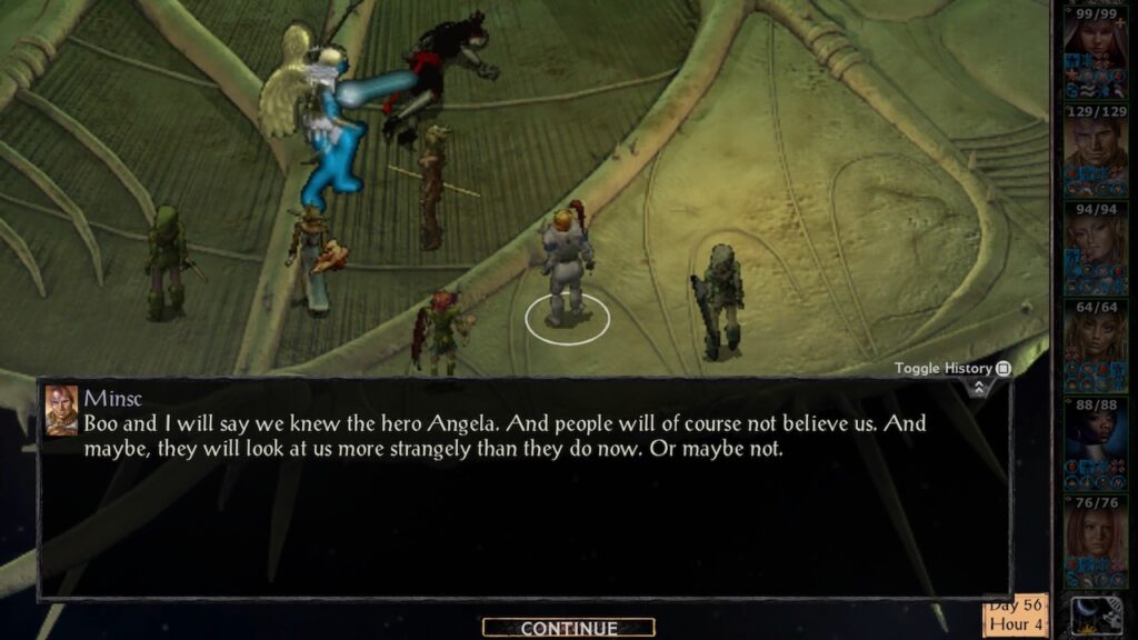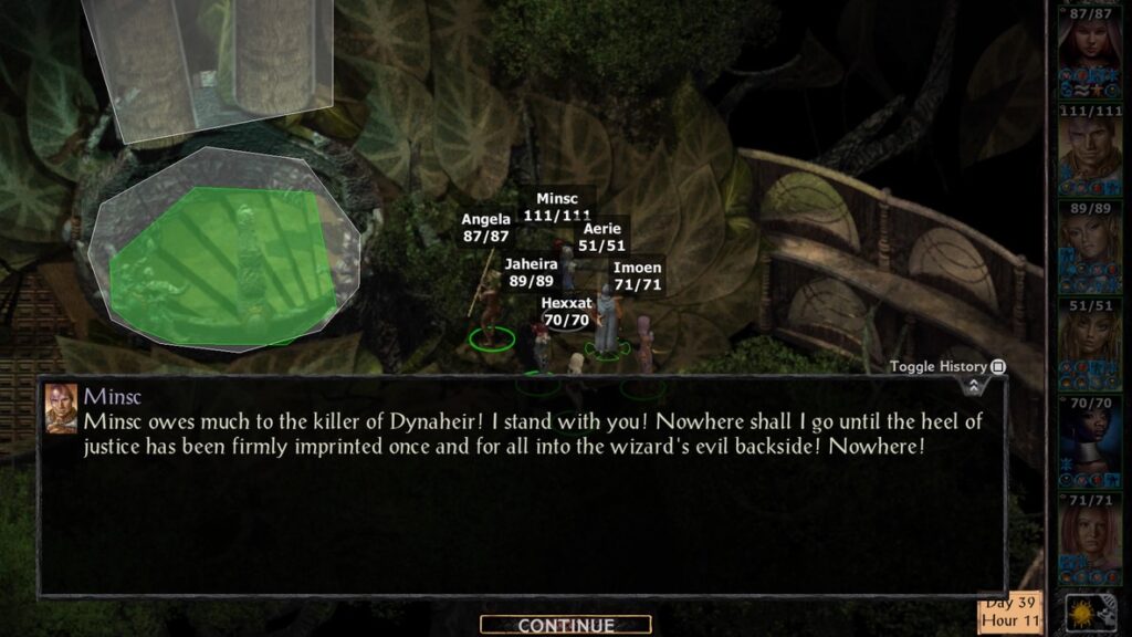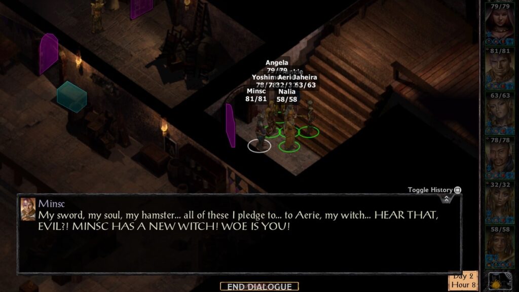 Also available is Viconia DeVir. She’s an antagonist in BG3, but is recruitable in BG1+2. In BG3 Minsc suggests that there was once a relationship between the two of them, but there’s no hint of this in the earlier games. If my party wasn’t full, I would have considered adding her just to see what happens.