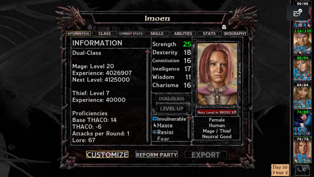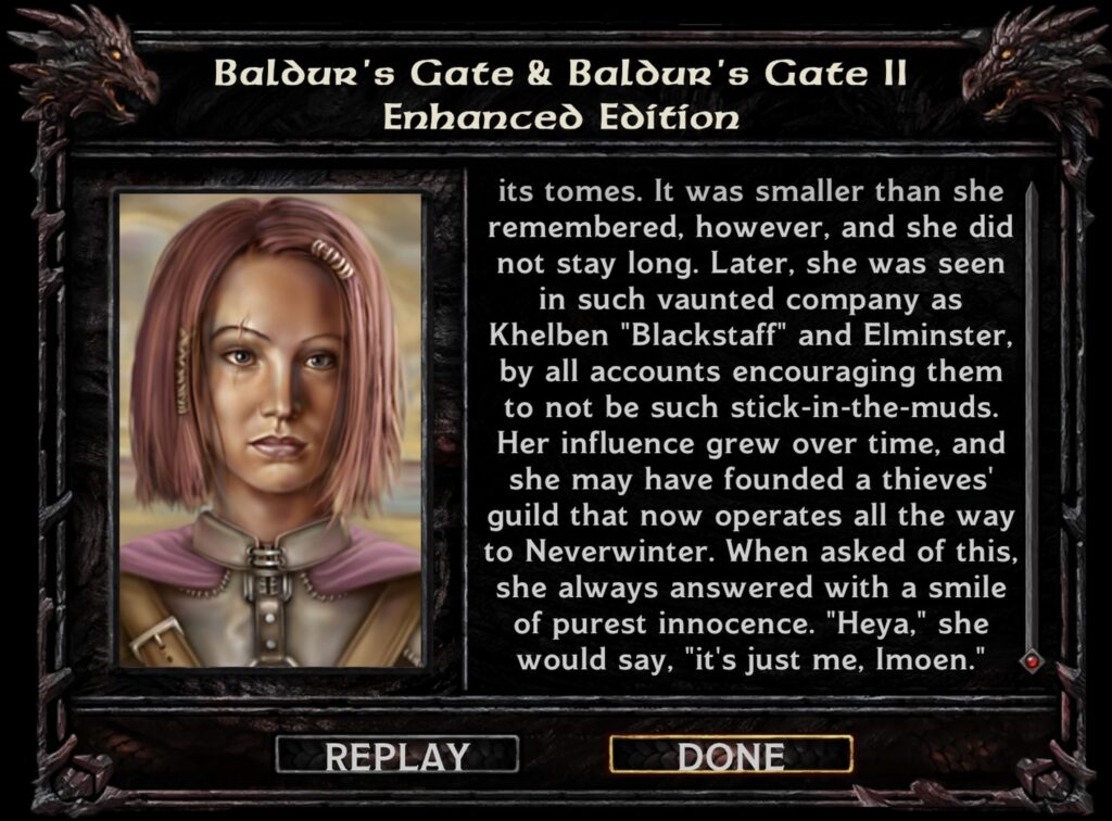 - Imoen – as noted above, the first potential companion you meet. She’s perky and cool to have around. I included her as much as I could, given that she’s forceably removed from the party for a time in BG2.
