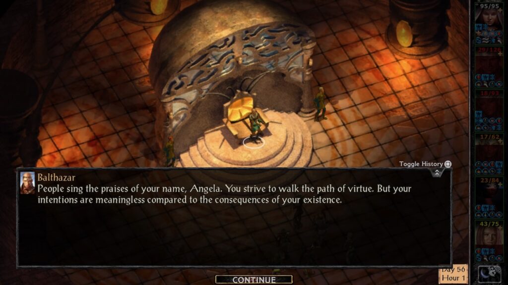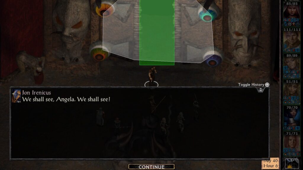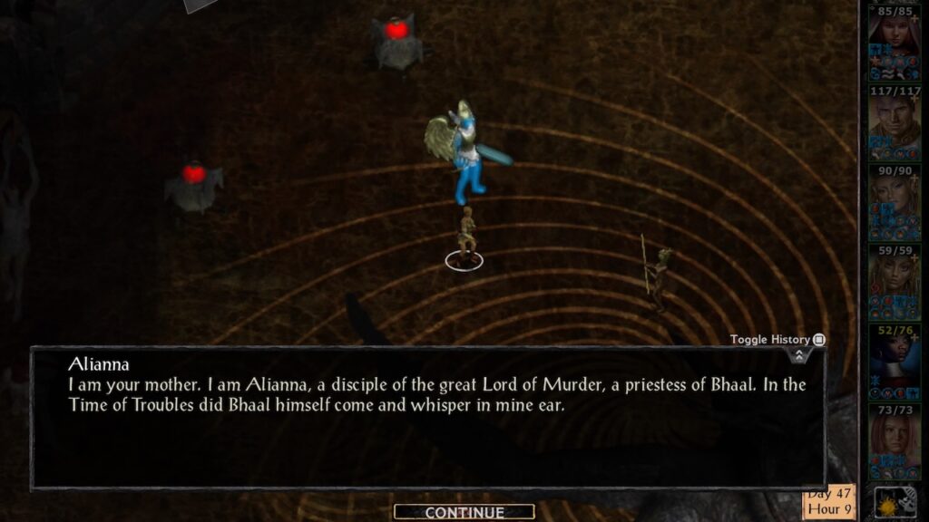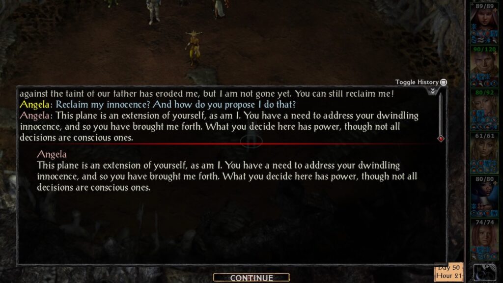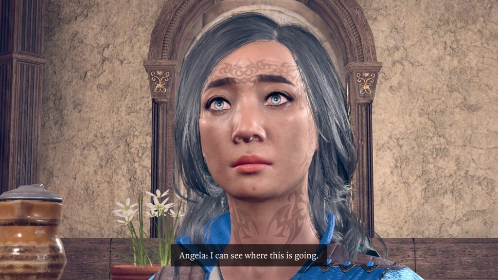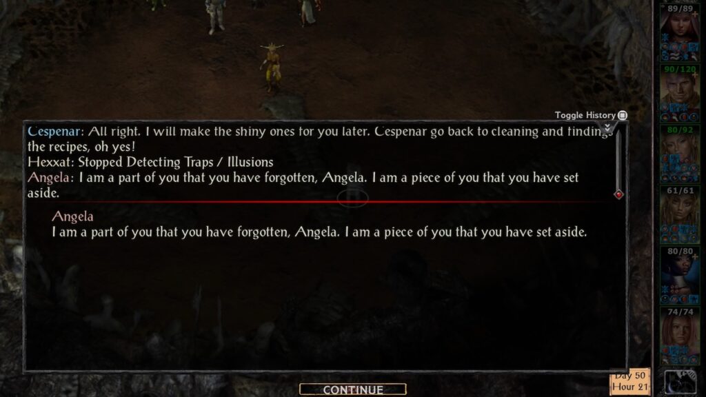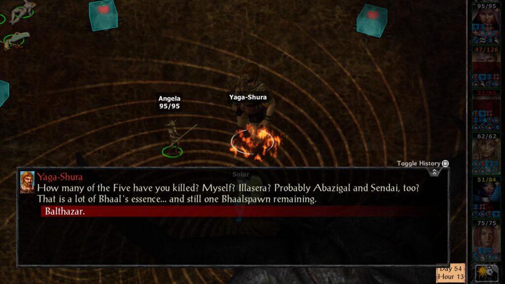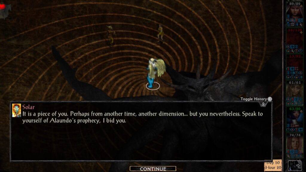 In Throne of Bhaal, Gorion’s Ward has visions of their past, present, and potential futures. Those visions are now tied to Druid Angela.