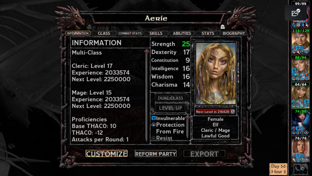Here we see that Aerie was Lawful Good. How she put up with being in party with a Neutral Evil character is beyond me. Because I played in Story mode, every character’s Strength was set to 25. (The exception was Hexxat, whom we’ll meet later.) -