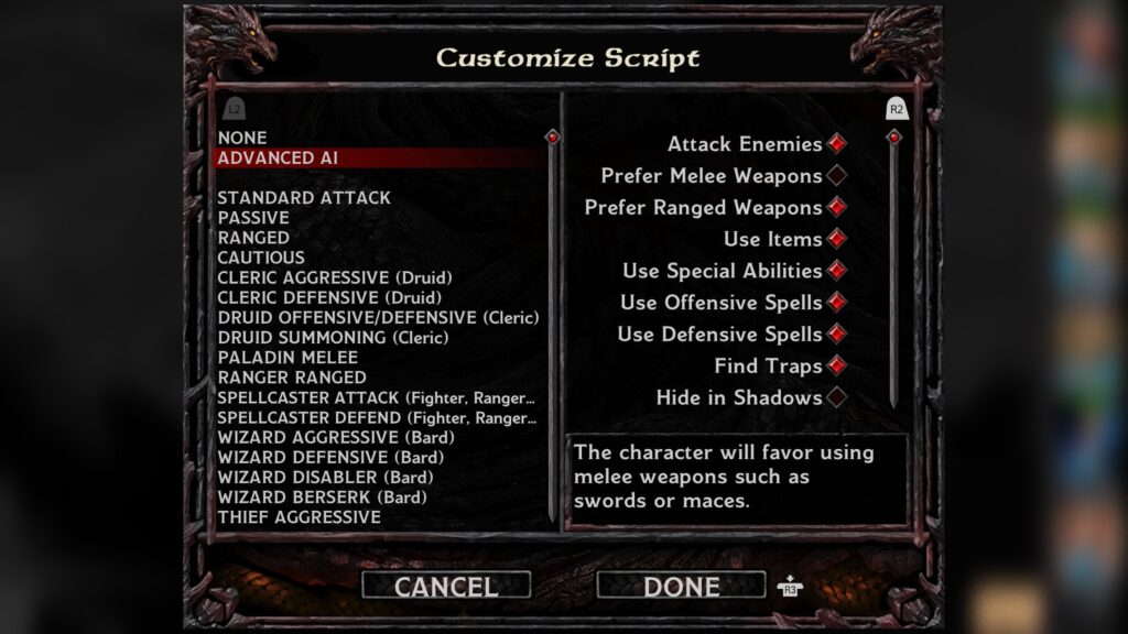 You have nominal control over the AI script used to determine your character’s actions. As near as I could tell, “Use Items” and “Use Special Abilities” didn’t do anything.
