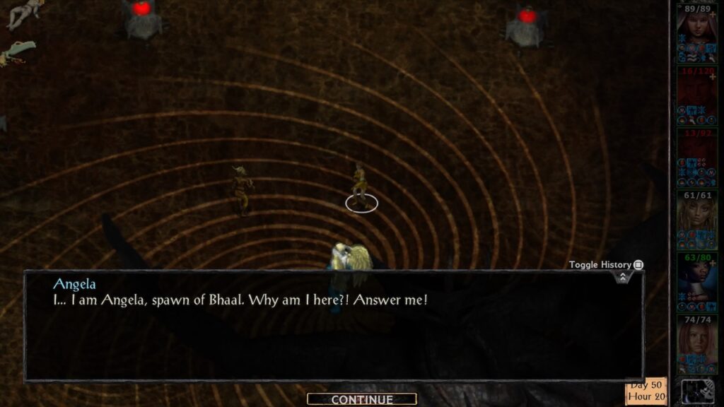 At this point, Druid Angela had a choice: To reject Bhaal’s powers utterly and become human, to accept the power of Bhaal and rule as Lord of Murder, or to accept the power but reject the taint of the Bhaalspawn.