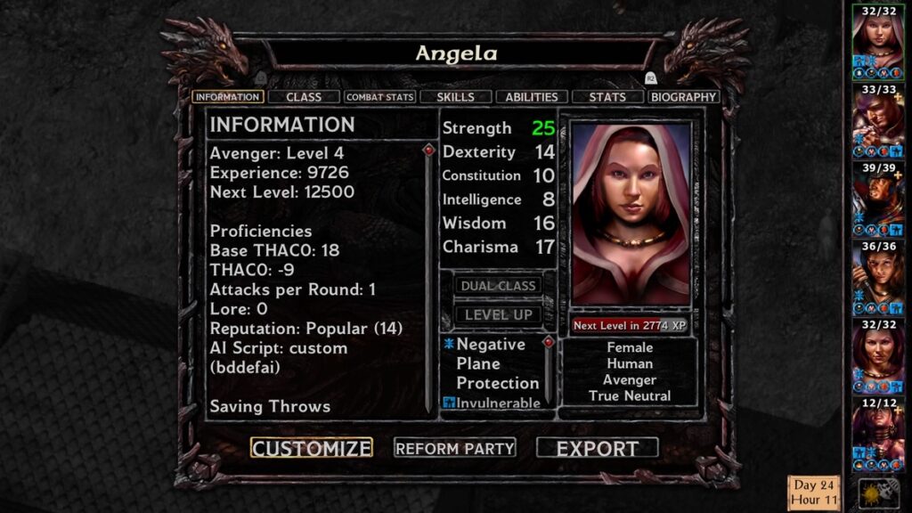 Umm, well… yes. As I was saying, in my playthrough of the Bhaalspawn Saga, the role of Gorion’s Ward was fulfilled by Druid Angela.