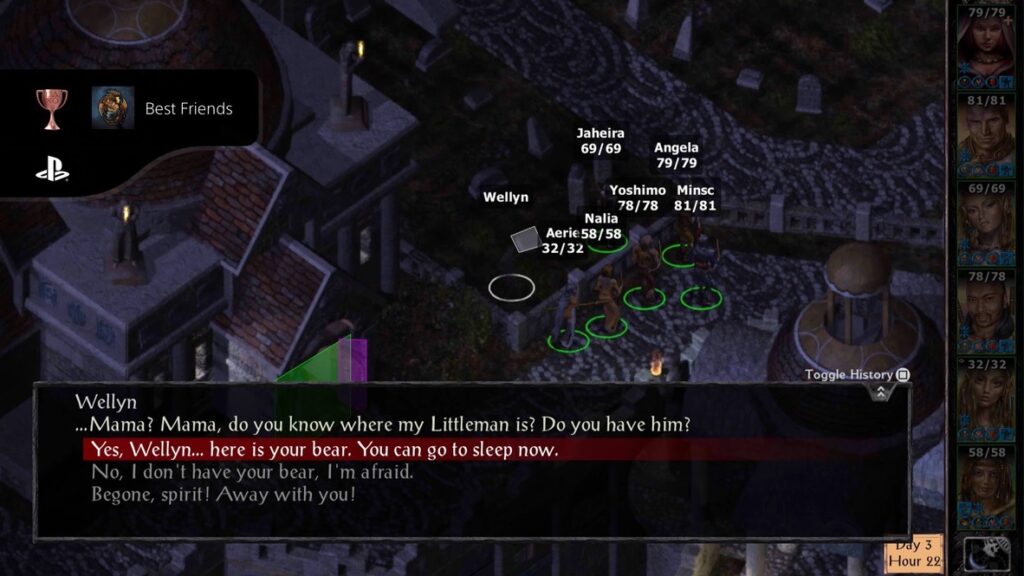On the PS5, when you earn an trophy or achievement in a game, the console automatically records the 15-second interval around it. Here’s the recording of a trophy I got that I didn’t want: Villain. It appears solely to do with being forced to fight some Flaming Fist. In the recording, although it’s fainter the rest of the audio, you can hear Minsc complaining about the deed. You can judge for yourself how closely Jim Cummings’ performance recorded 25 years ago compares with Matt Mercer’s.