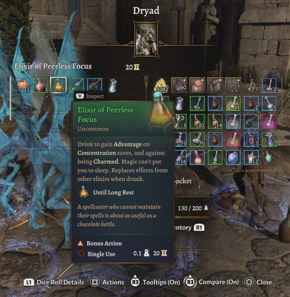 All these new consumables have been added to Daphne’s skill wheels. Since the elixir will last until the next Long Rest, she might as well drink it now.