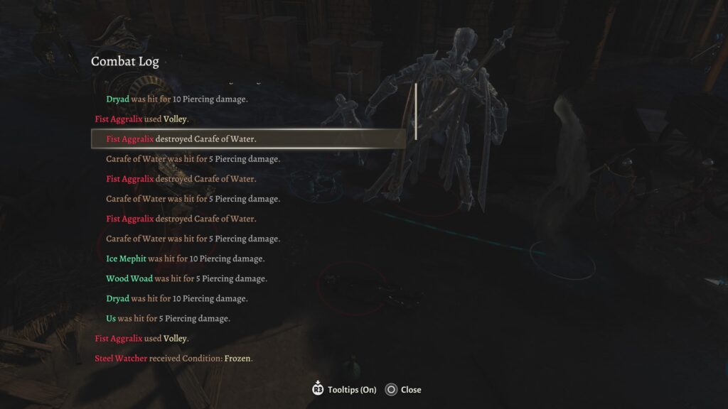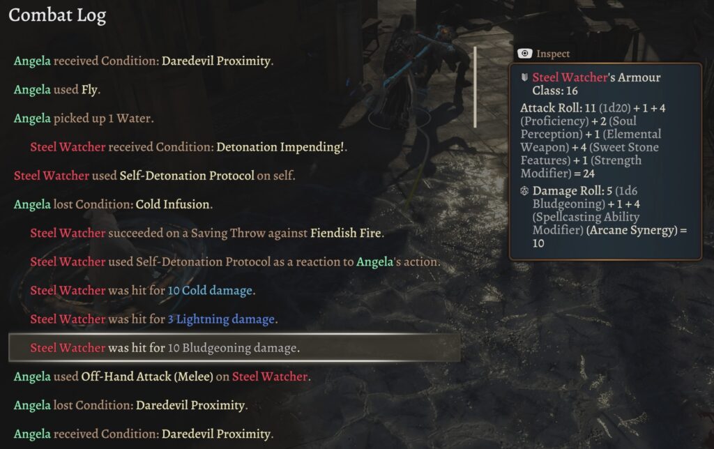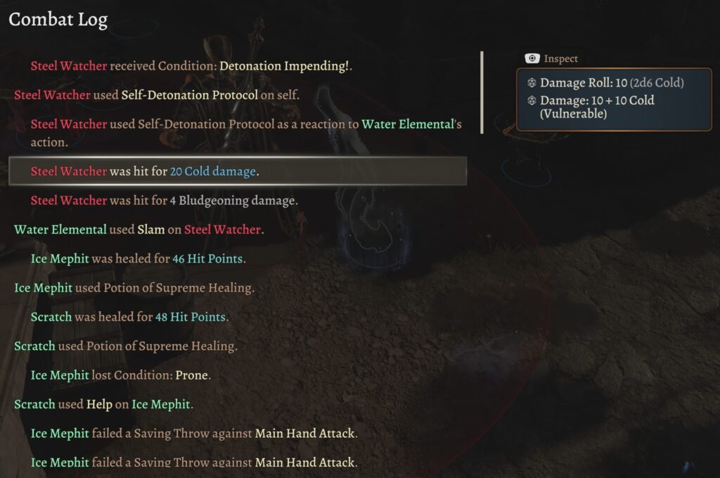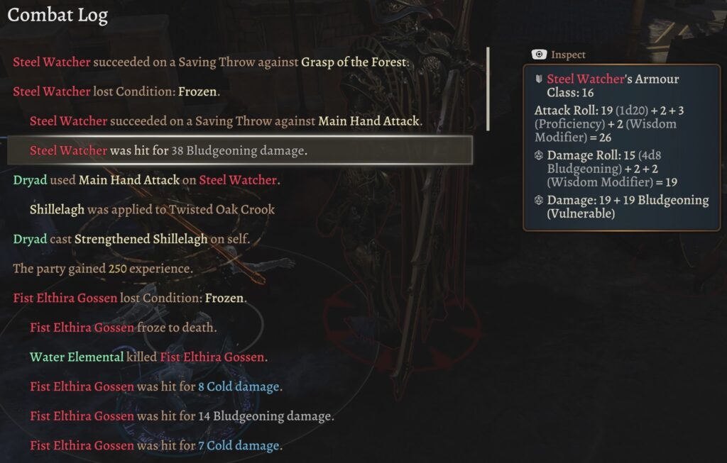 From this Combat Log, reading from the bottom up, we see Scratch helping Iva back up, Scratch using a healing potion on himself, Iva using a healing potion too, and Aegean administering the coup de grace on the Steel Watcher. Although Druid Angela provided the initial damage at the start of the combat via her spells, it was the minions working together that brought down the Watcher.