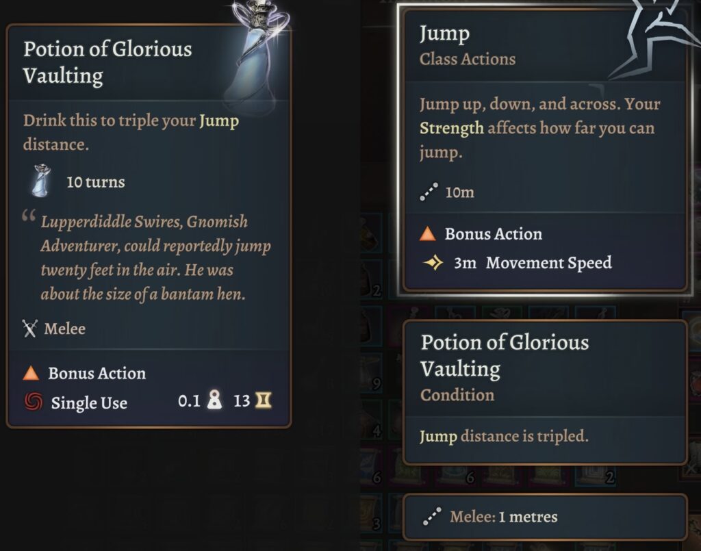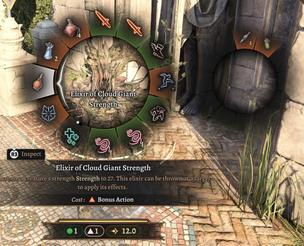 Here are Creak’s skill wheels after he receives his consumables. The Potions of Glorious Vaulting are right next to the Elixir of Cloud Giant Strength on his wheel. He might as well drink the elixir now, but since the potion only lasts ten turns, he should wait on that one until the combat starts.