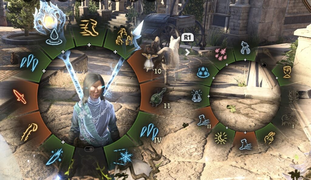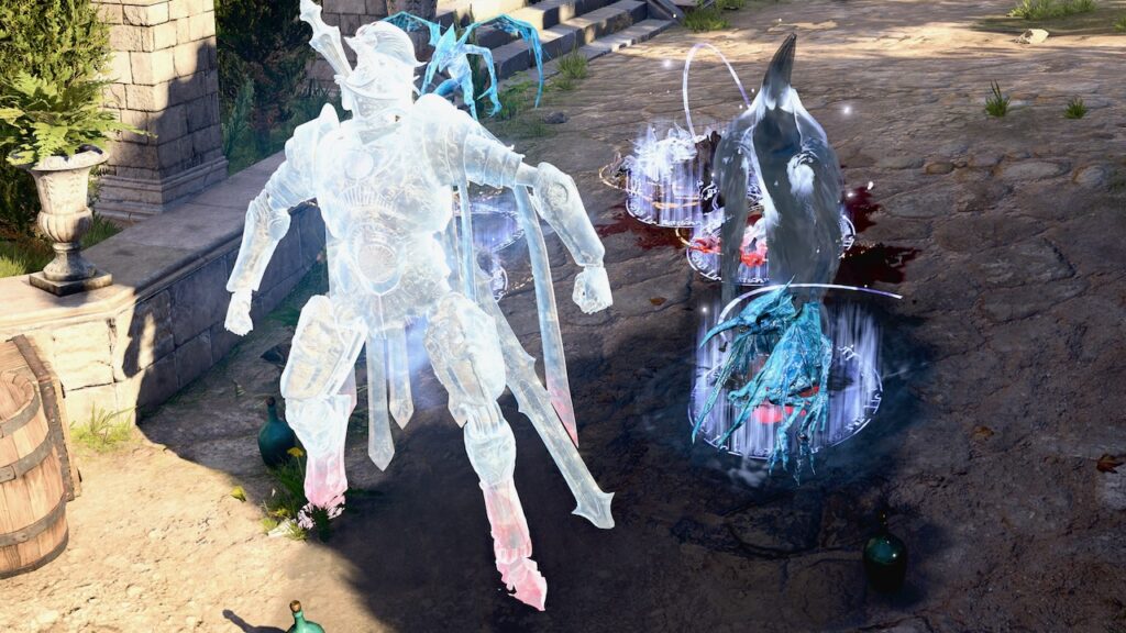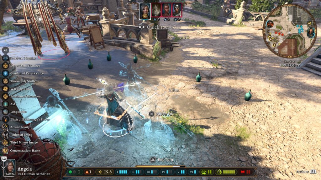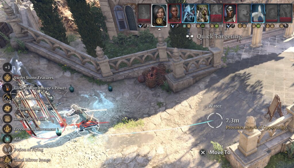 The minions aren’t the only ones with new consumables on their skill wheels. I found that it was easier to perform my immediate pre-battle prep if I put the items on my skill wheel, going counter-clockwise from the 3 o’clock position: Malice, Potion of Flying, Mirror Image, Haste, then rush forward to cast Create Water. All of these potions/spells are time-limited, so it’s best if I can invoke them with as few delays as possible.