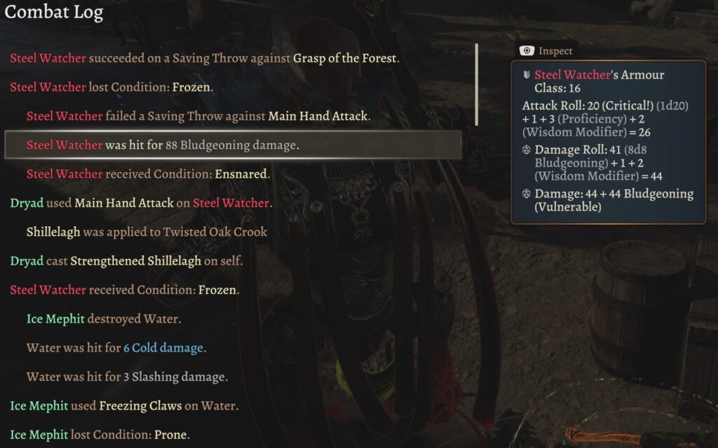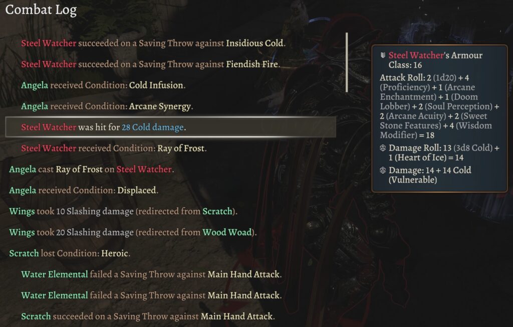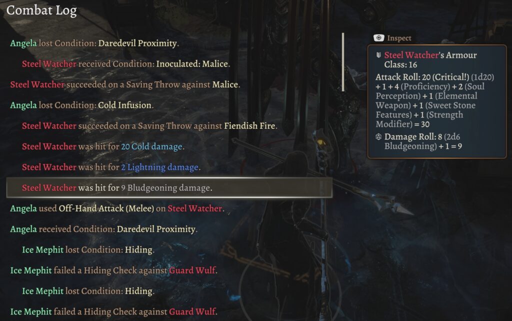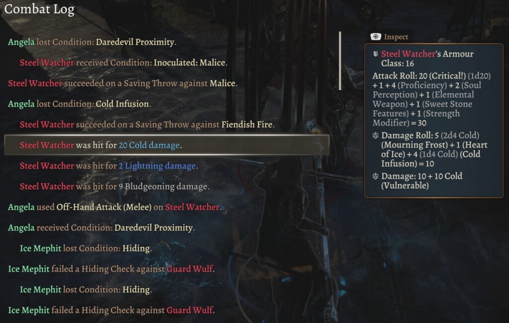 Druid Angela has nothing better to do with her Bonus Action, so she strikes with an off-hand attack using the Cold Snap dagger. You can see only 3 Piercing damage; the Steel Watcher has Resistance to Piercing damage and nothing has been done to address that, nor does Druid Angela particularly care. The Cold damage is still doubled; it’s not what Ray of Frost can do, but it’s better than nothing.