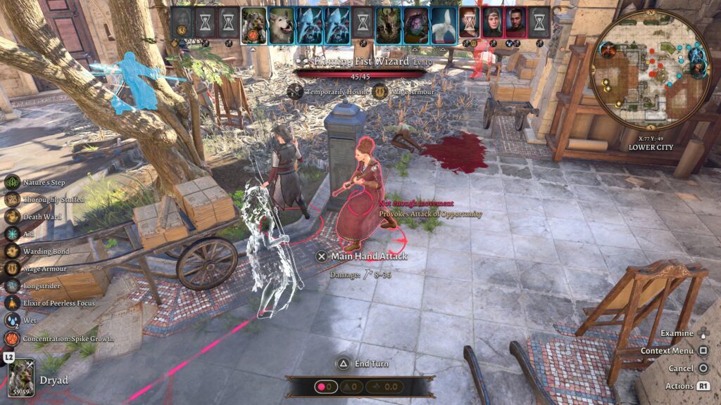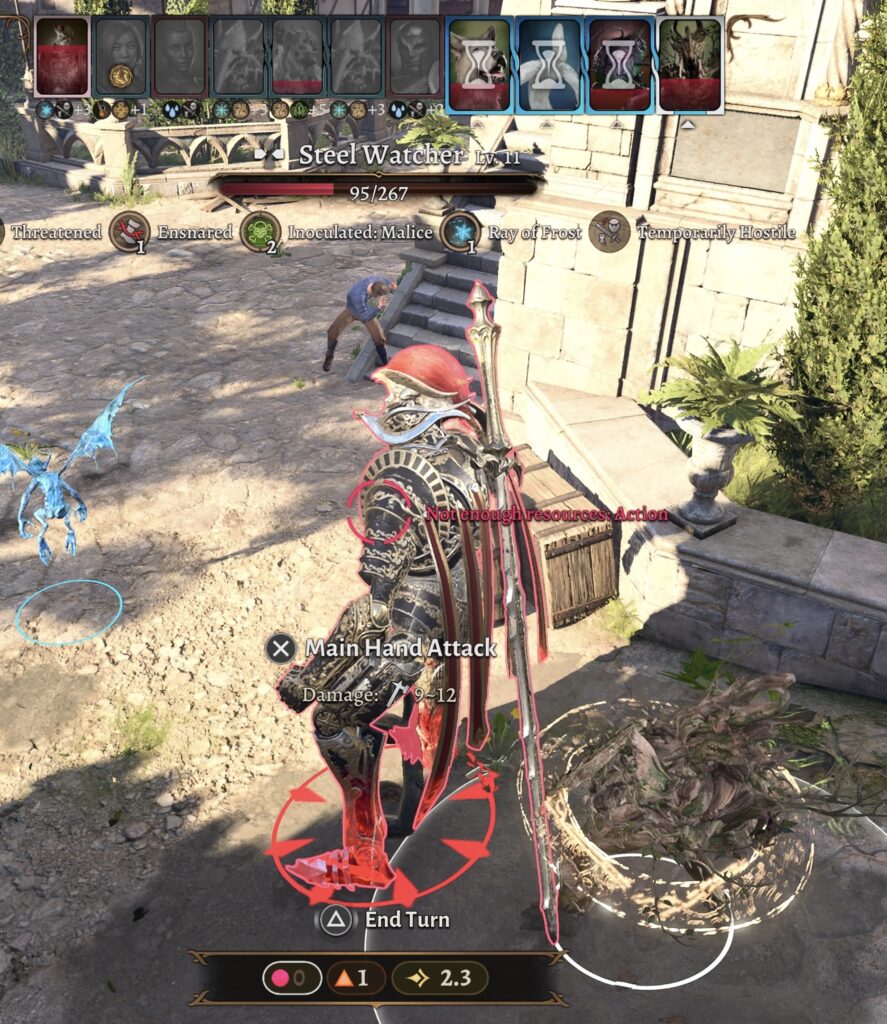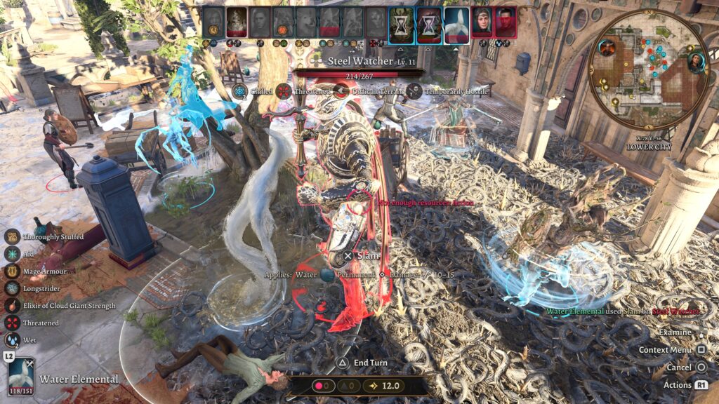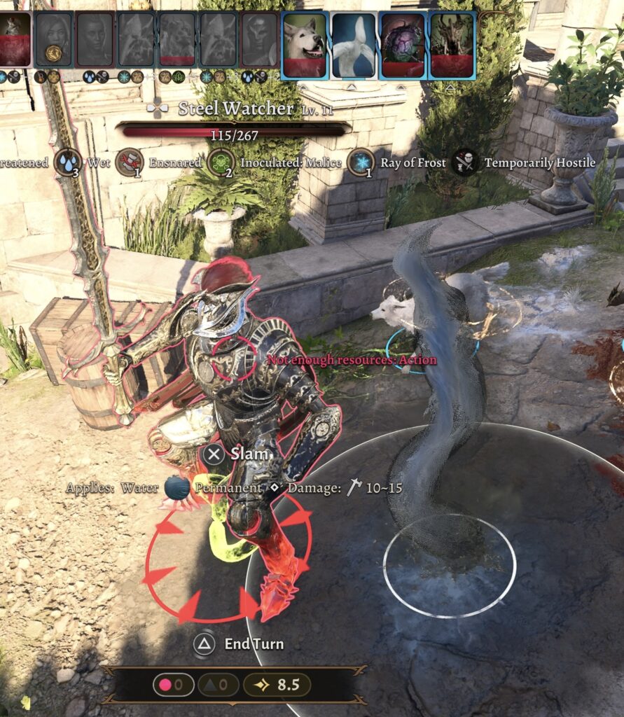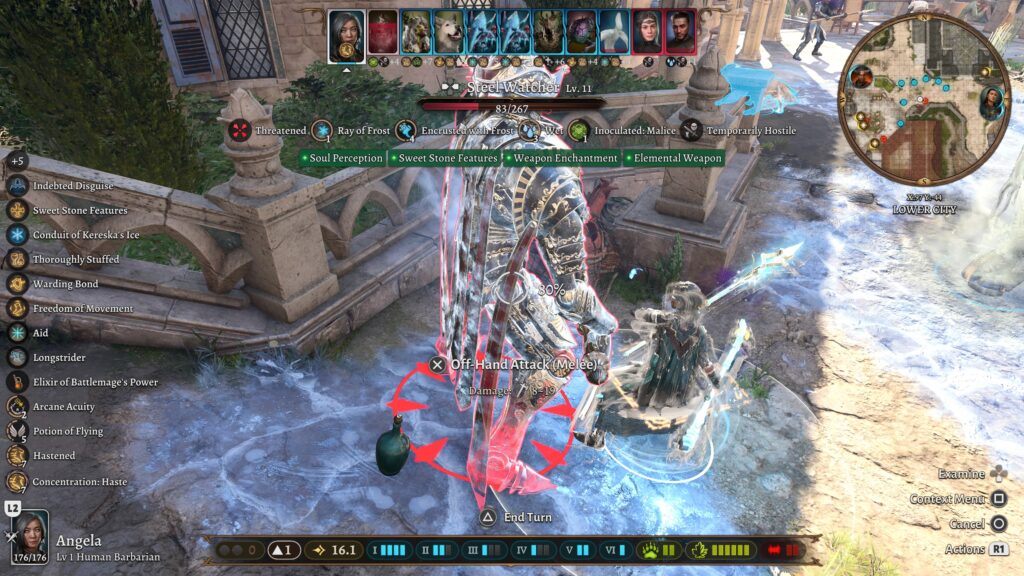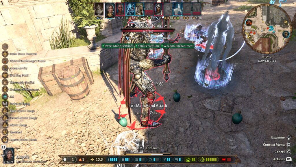 Druid Angela absolutely wants to provoke the Steel Watcher’s Opportunity Attack. That means the reset of her minions can duck in-and-out with attacks of their own. Oh, the Steel Watcher missed due to Mirror Image? Thanks to Cold Snap, it’s Chilled now.