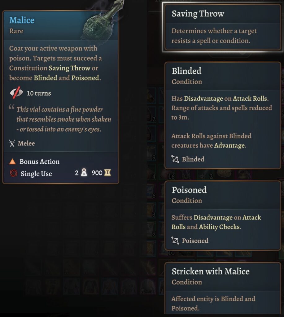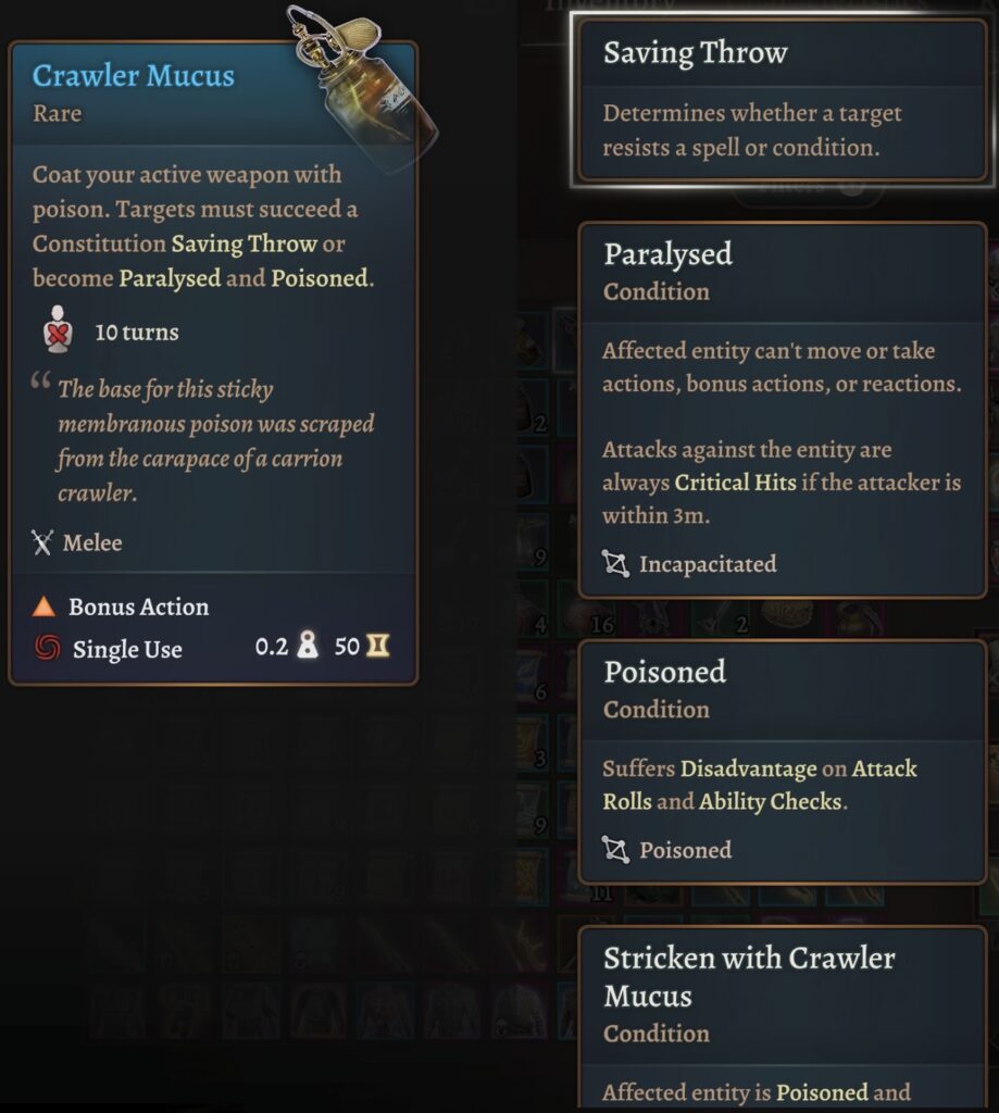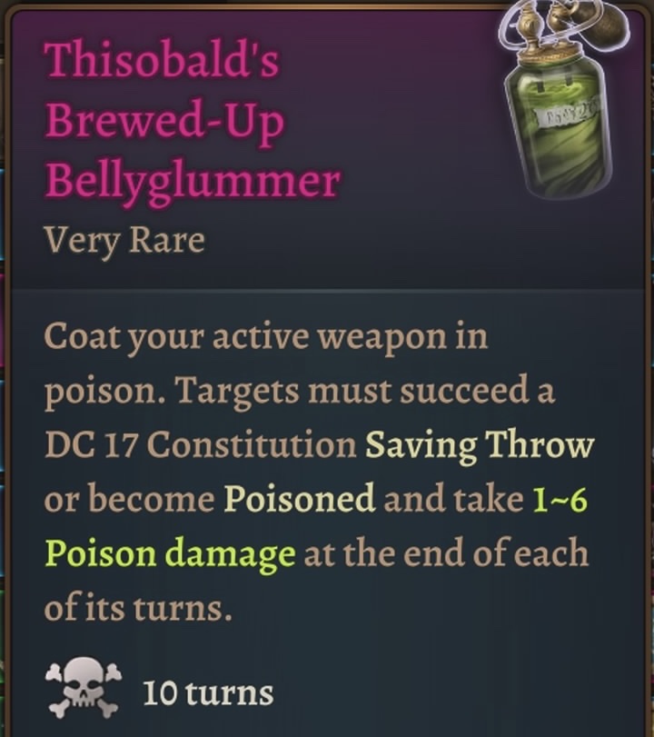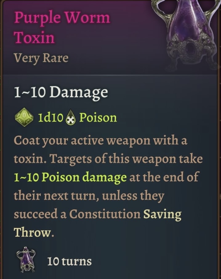 Purple Worm Toxin is an example of a weapon coating that I’m not likely to use. It can do damage, but doesn’t affect the enemy’s abilities. To counterbalance that, it requires a CON 19 saving throw to resist, making it the most likely poison to affect enemies in the game.