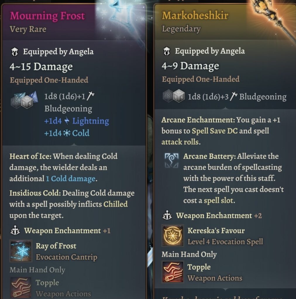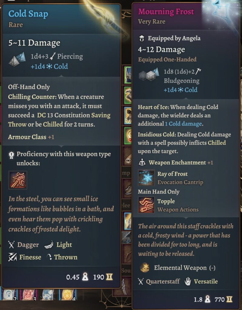 Errata: A couple of weeks after I wrote the above, I learned that there is a bug in the implementation of Cold Snap. Despite what the tooltip says, if an enemy misses they don’t make a CON Save; they’re simply Chilled. All things considered, dual-wielding with Mourning Frost in her off hand is still probably better for Druid Angela. But, as you can see in the next post, enemies miss her a lot, so there might be situations in which Cold Snap is worth considering.