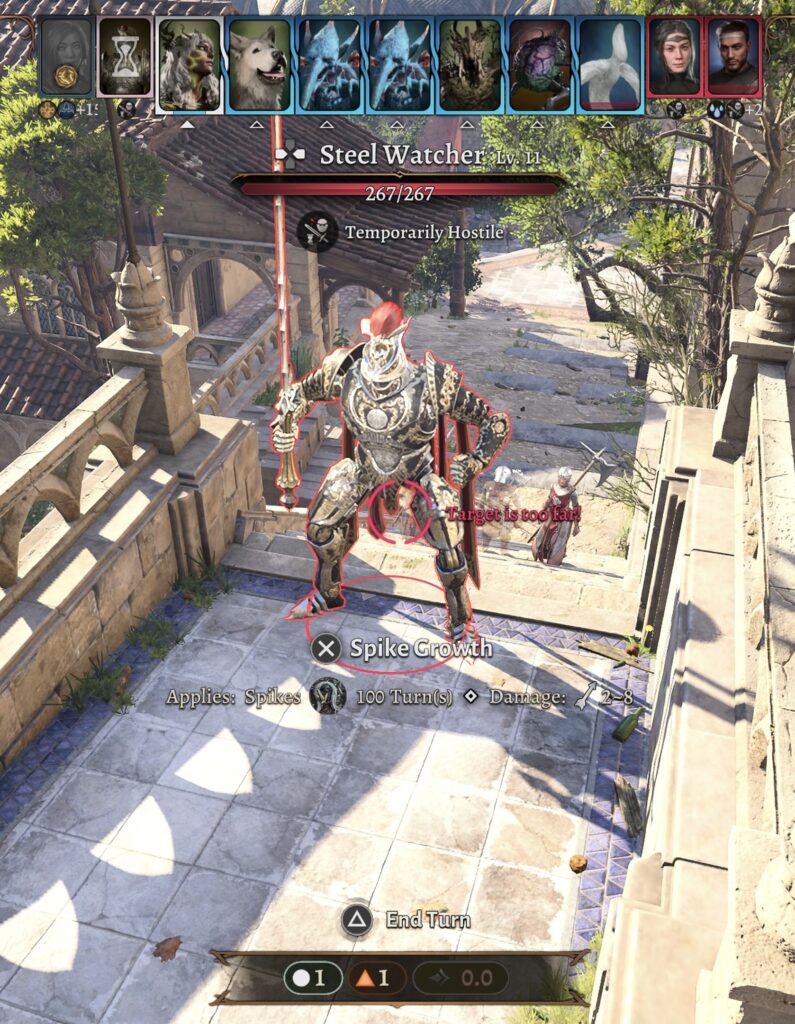 But the battle got complicated. A nearby Steel Watcher joined the fray. Strangely, the guards behind it did not join too. Perhaps they’d learned of Druid Angela’s fearsome reputation. As you can see, Daphne the Dryad cast Spike Growth to slow it down. However, that had unexpected consequences.