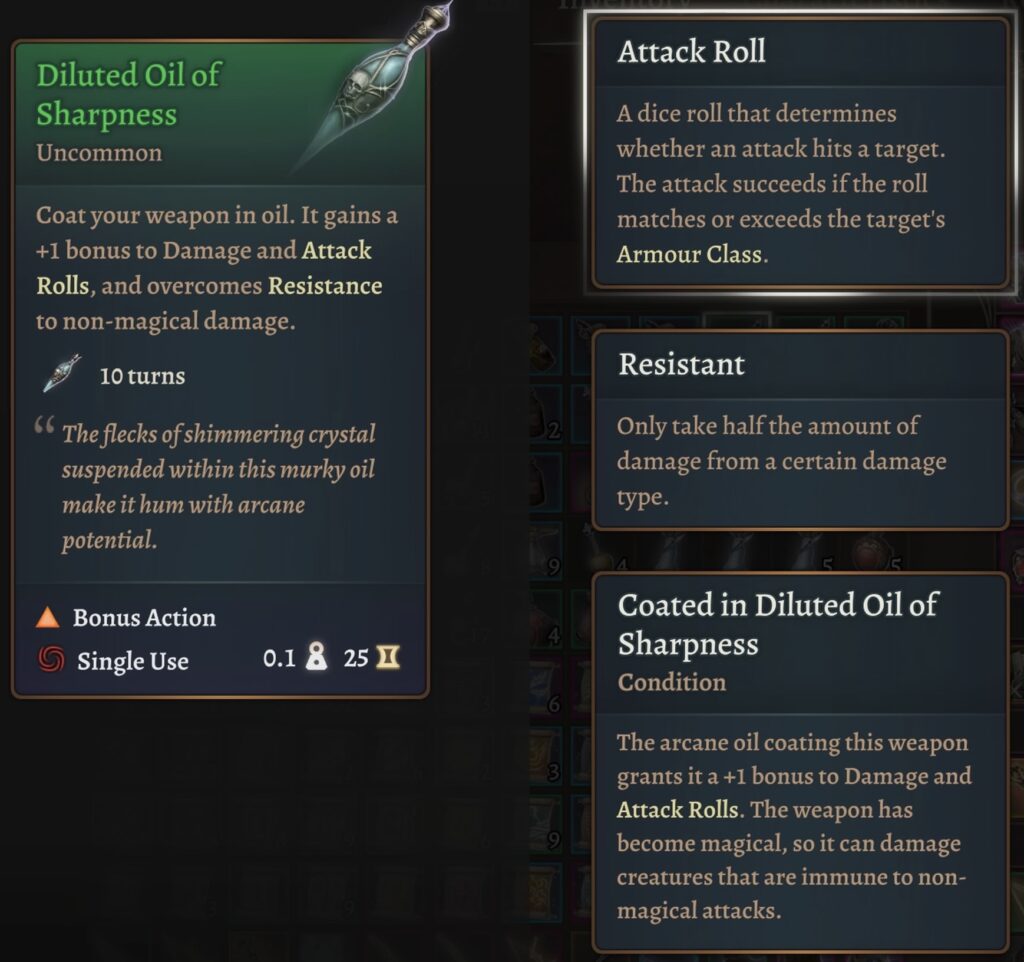 • The minions who held weapons that could do Bludgeoning damage, Daphne and Creak, each got a Diluted Oil of Sharpness. I’ll have more to say about this choice below.