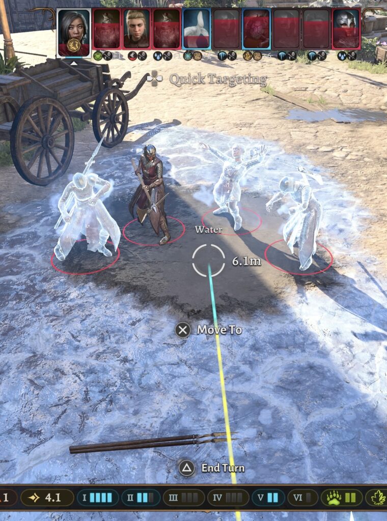 The battle started as usual. After all the preparations, open with Create Water to make the opponents Wet. This time, Druid Angela was first in the turn order. She moved forward and dropped a lot of water bottles.
