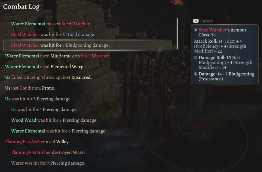This is from the third battle described below. Druid Angela attacks the Steel Watcher with her off-hand staff, Mourning Frost. If you look at the description of Mourning Frost above, in Druid Angela’s gear, you’ll see “Weapon Enchantment + 1”. That means the weapon is magical. So the Steel Watcher takes full damage from the Bludgeoning attack. Again, the Cold damage is a different story.