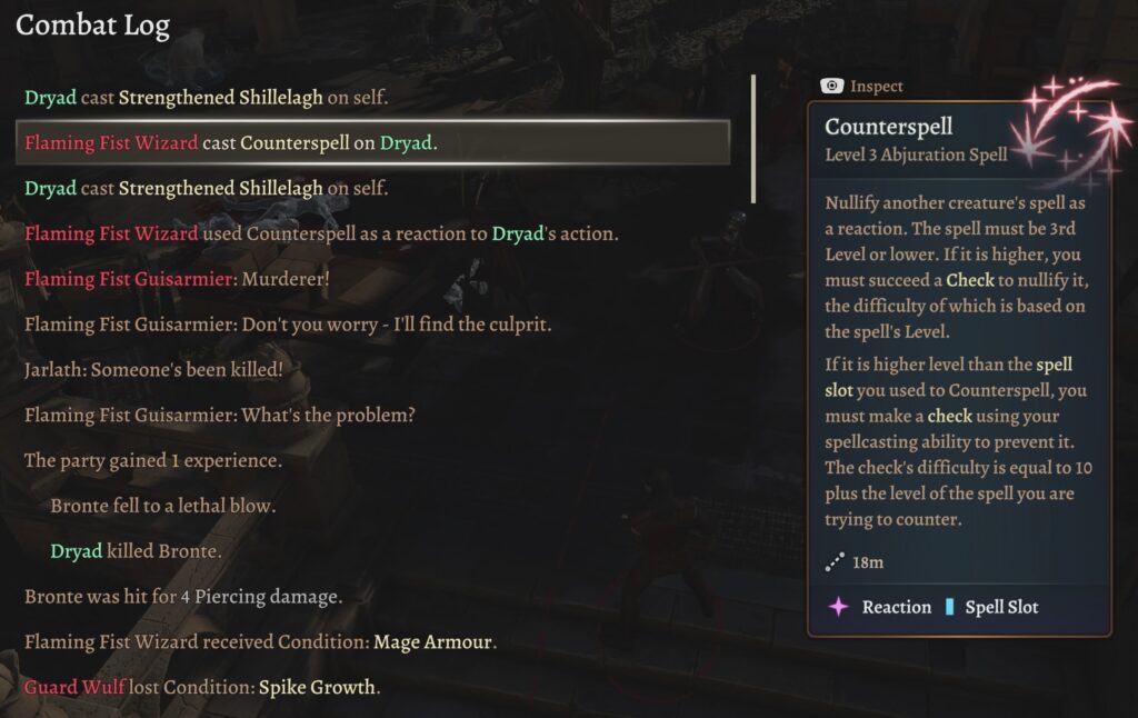 From this combat log, you can tell that the Flaming Fist patrol was summoned by someone named Jarlath. It appears that Jarlath complained because a civilian, Bronte, was killed by Daphne’s Spike Growth. All Bronte had to do was stand still, but folks panic. So perhaps it’s all fair.