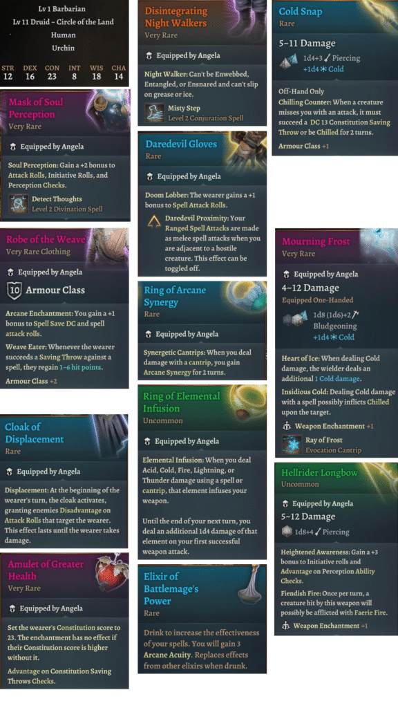 • I became concerned that Druid Angela’s Spell Save DC was getting too low, so I switched her chest armor back to Robe of the Weave.