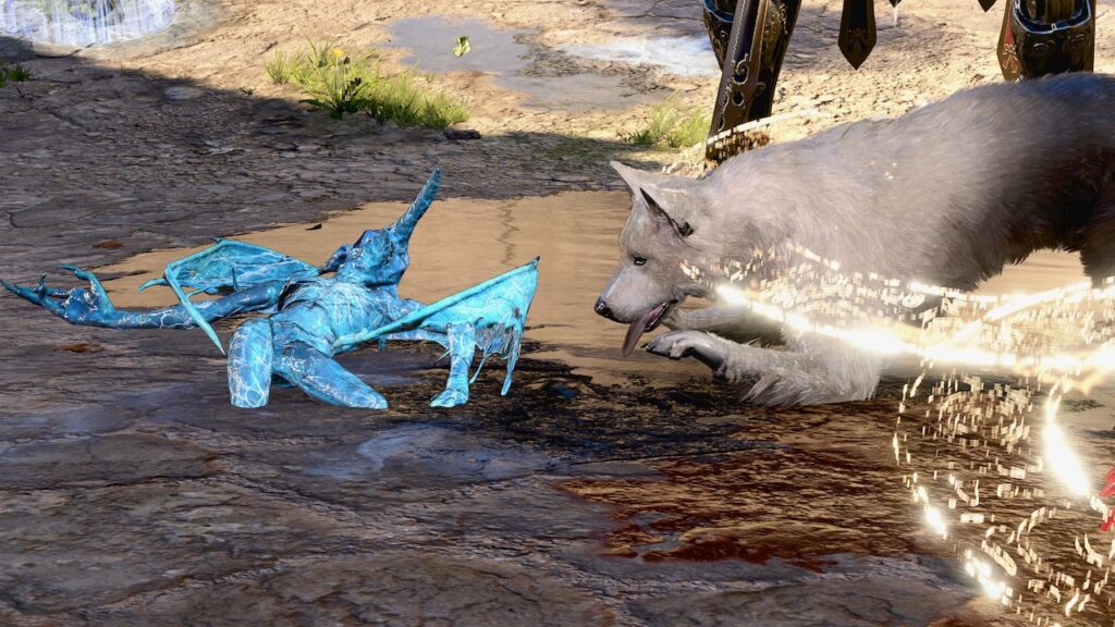 She followed up with a nice “bonk” from her off-hand staff. The Wet Condition makes a target Vulnerable to both Cold and Lightning. The extra Lightning damage from the Draconic Elemental Weapon of Drakethroat Glaive doesn’t do much. But Druid Angela has seen times when it’s Electrified a water surface.