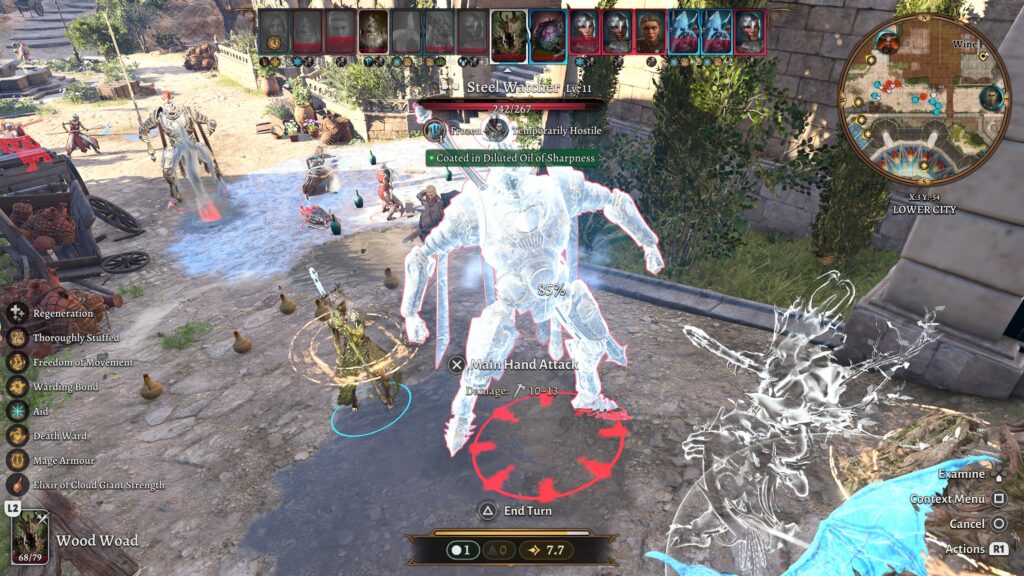 Creak the Wood Woad coats his staff with the Diluted Oil of Accuracy and gives the Frozen Steel Watcher a good bonk of his own. This removes the Frozen condition from the Watcher, but note the overall result: The Steel Watcher is down to 95/267 hit points, and was Frozen twice in the first round of combat. These are pretty good results for a tactic that I’d abandoned.
