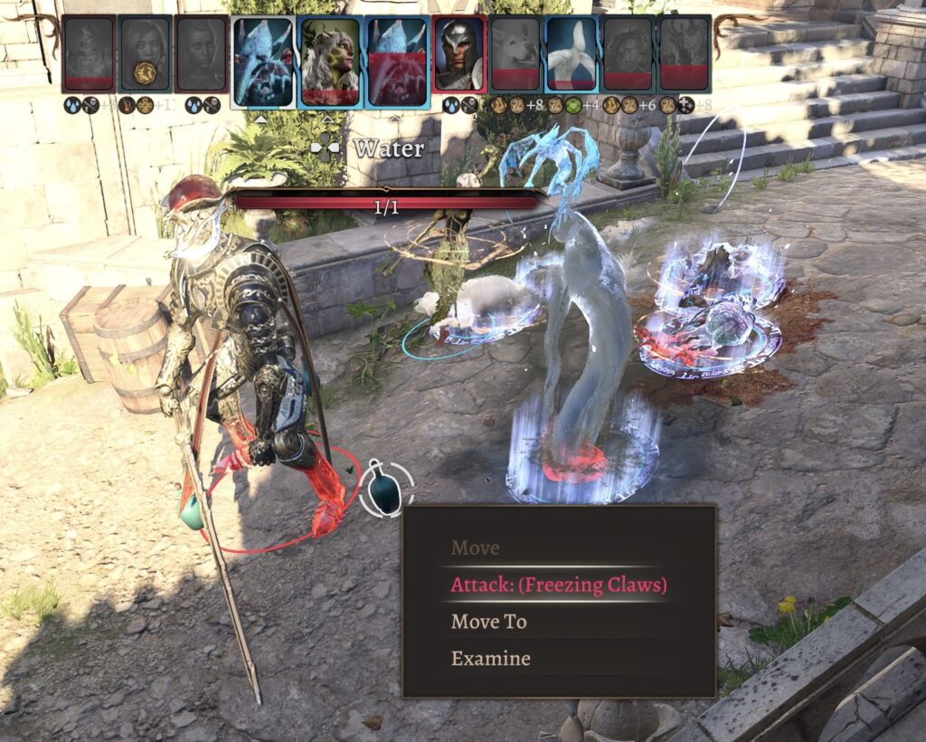 Here’s an example of when it all comes together. The Steel Watcher was Frozen; you can see it lost that condition after Daphne’s blow landed. Daphne had previously cast Strengthened Shillelagh on her staff, which makes it magical. So her blow does double damage.
