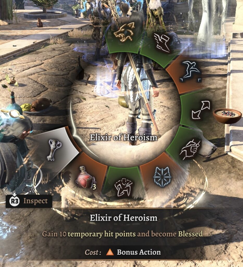 Here’s an example of the results. Druid Angela has just pushpocketed an Elixir of Heroism and some healing potions onto Scratch. There’s no reason to delay, so Scratch is about to drink the Elixir using his ability wheel.