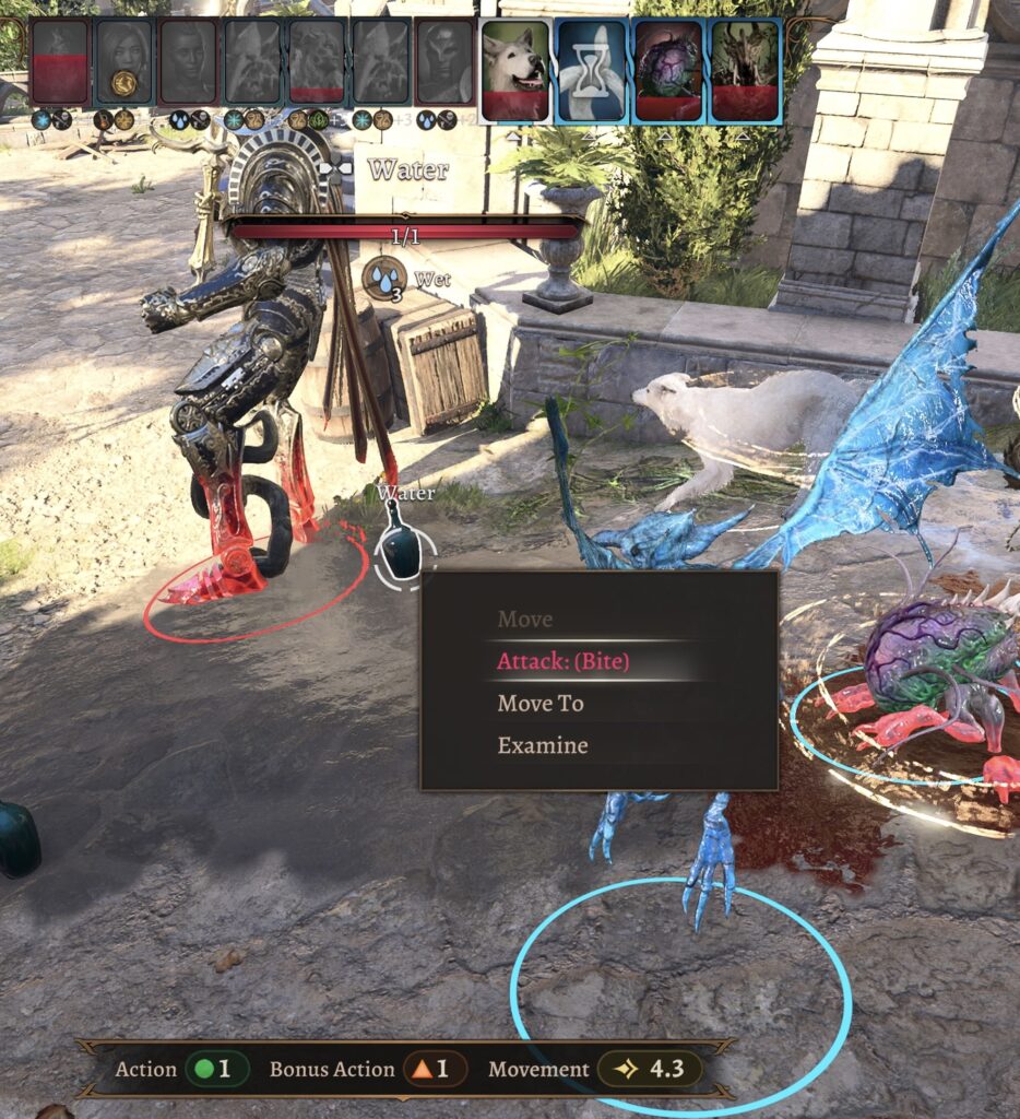 Minions can’t drop items from their inventories the way regular characters can. But they can Move items on the ground. Here we see Iva “walking” a water bottle over to the Watcher, in order to attack the bottle and make the Watcher Wet again.