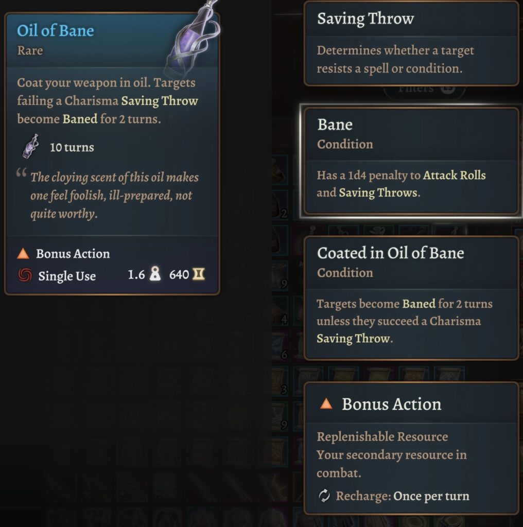 • As for Druid Angela, in one test she used Oil of Bane and in another she used Malice. Again, it’s all too easy for the enemies to resist these effects. Perhaps one enemy, if that, in each combat was affected by her weapon coating.