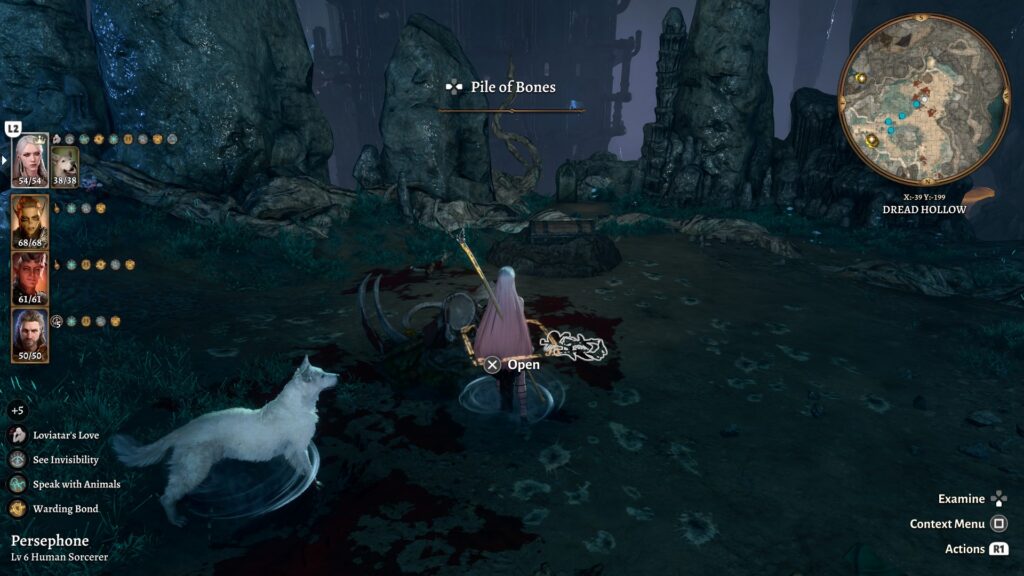 While you are exploring Lenore’s bedroom, you find a button very low to the ground (everyone comments on this, so it’s meant to be important) that ostensibly does nothing. However, if you had dug up a doggy’s grave earlier in the Underdark—because you’re a monster—and put on its collar, then when you hit the button, a steak appears. So the grave belonged to Myrna, Lenore’s dog that passed away.