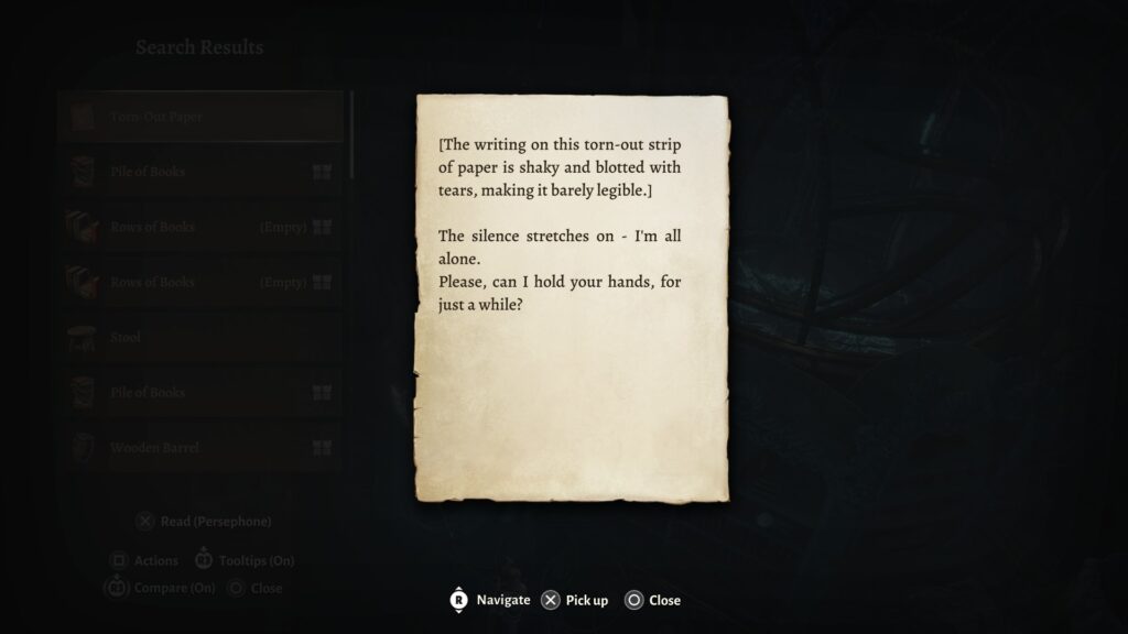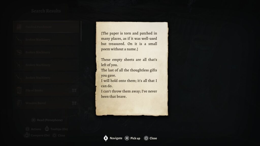 Aha, so Lenore had a friend named Yrre. It says they were only together for a short time, so what happened to him? Unfortunately, it doesn’t take long to put the pieces together. As you explore the tower, you find scraps of paper and handwritten poems throughout.