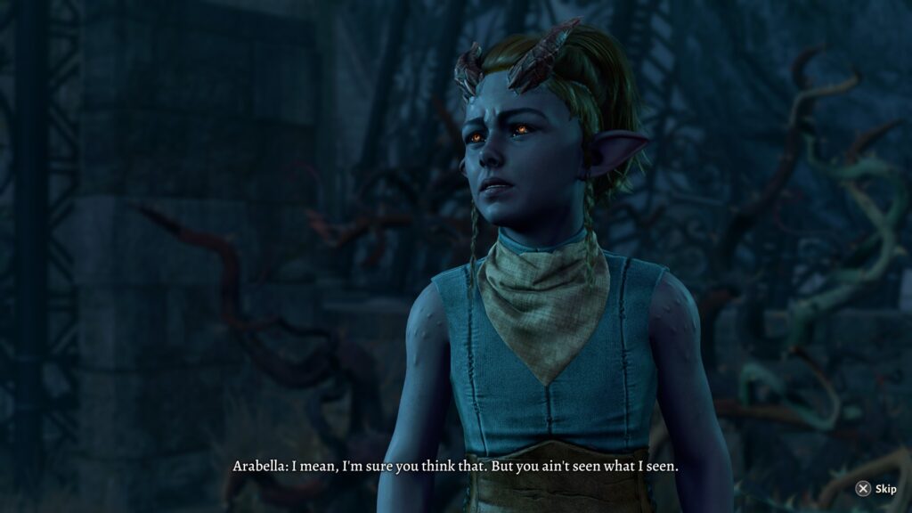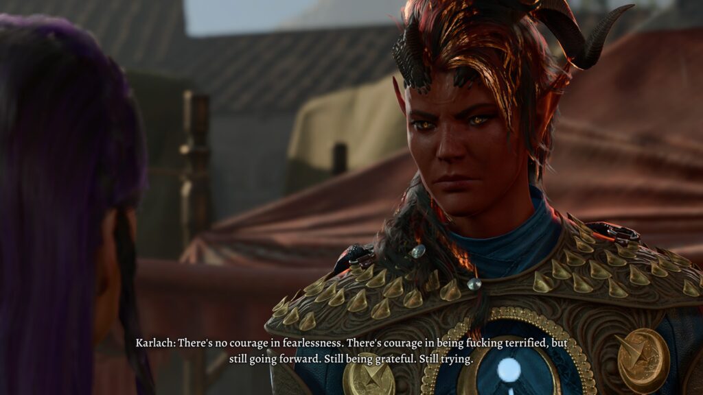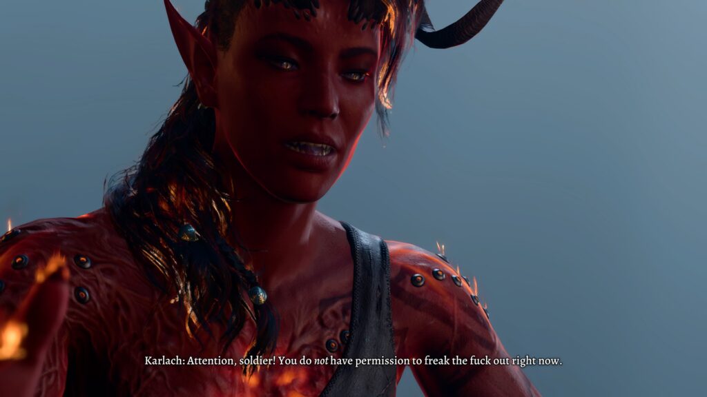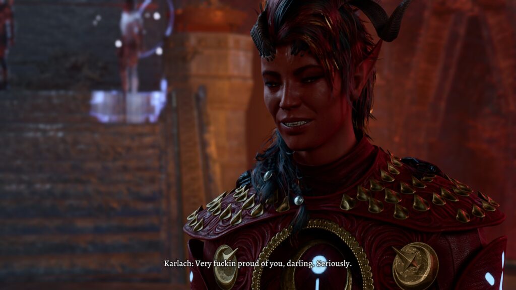There was one scene in particular in Act 2 that was lovely, and funny, and a little horrifying. Karlach was an absolute gem during it, and made it totally worth it. Just unquestioningly loyal, but firm about you working out your shit. Out of curiosity, I looked up on YouTube how the other companions would react (aside from Astarion, so I don’t spoil myself), and Karlach was absolutely the best one to romance for that scene.