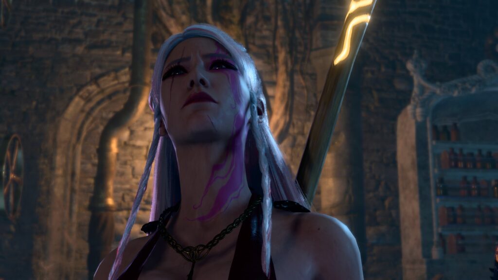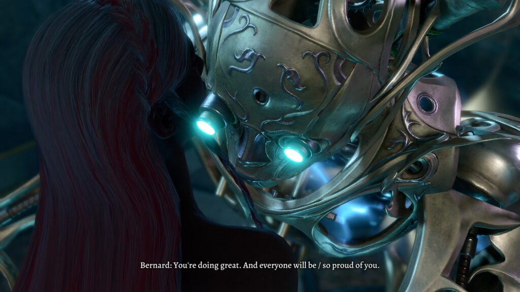 There is a Big Choice that occurs in Act 3 that basically decides whether your Urge character is Dark or Light. With Oleandra, I made the Dark choices, with horrifying, horrifying consequences. With Persephone, I rejected the choice and got an entirely new cutscene. The length and depth of this cutscene tells me that this is what the writers were happy to have someone choose, because it’s a cool as hell cutscene, drawing in a side character that we don’t usually see very often.
